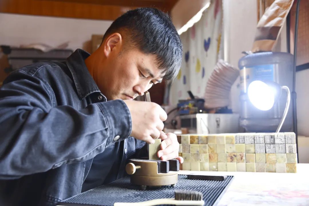 在龚栋强十多个平方的宿舍内,堆满了切割机、吸尘器以及篆刻印章的材料,还有老旧的六方砖、巍山历史文化方面的书籍,龚栋强每天都会工作到深夜。他根据巍山县政协文史资料《巍山名流100人》内容,篆刻创作100件系列印章已经完成设计并创作过半。“历史上滇中著名的‘蒙化十六景’中,‘东山济胜’和‘石龙晚眺’两景都与自由村有关;多雨村风光秀丽,保留了难得的原生态民族文化;东山灵泉更是有着深厚的历史渊源。这些都是我们自由村乡土文化蕴藏的潜力。”短短半年时间,龚栋强对巍山的历史文化以及自由村的自然景观、历史文化、民间工艺、民风民俗等有了自己的认识,谈起来头头是道。龚栋强的心中,有着一个美好的愿景,深入挖掘乡土文化潜力,实施传统工艺振兴计划,发展文旅产业,让非遗文化、民族服饰、绿色产品形成品牌效应,运用现代工艺、找准市场脉络、不断研发创新,促进巍山传统工艺文创产品提高品质,以文化振兴赋能乡村振兴。