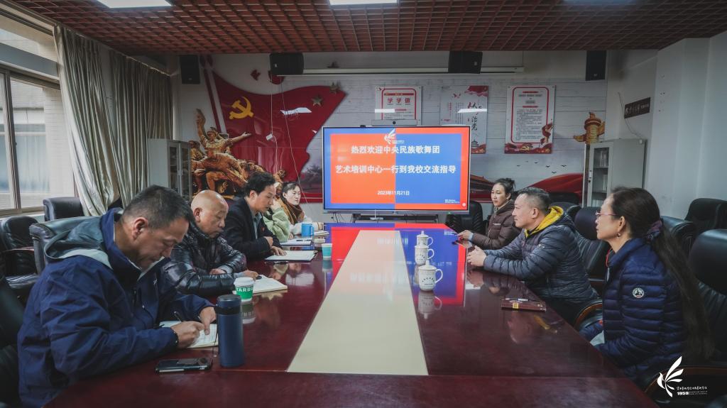 2023年11月21日,中央民族歌舞团艺术培训中心主任母宗健、国家一级演员赵湘老师、符妍老师一行来到我校就开展少数民族地区舞蹈美育教育工作进行交流座谈。会议由云艺附艺校王飚岚主持,云艺附艺校农布七林校长、舞蹈支部书记李雪虎及相关教师出席座谈。