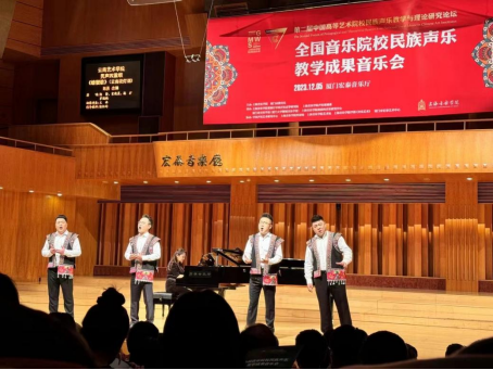 12月5日晚,第二届中国高等艺术院校民族声乐教学与理论研究论坛全国音乐院校民族声乐教学成果音乐会在厦门宏泰音乐厅举行,音乐学院选送的男声四重唱云南花灯调《螃蟹歌》由青年教师陈澄、宋晓晨、杨扩、罗聪鹏上演。