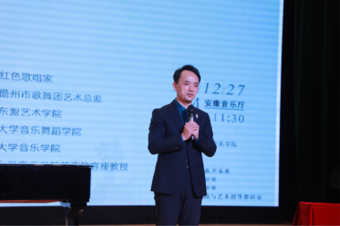 12月27日14:00,《民族声乐演唱中的个性》——公开课在音乐学院B403报告厅开讲。陈永峰根据演唱技法,训练方法,表演状态等内容对吕灿志等15名同学进行了现场指导,对《遥远的地方》《新货郎》《父亲的草原母亲的河》等歌曲进行了细致的作品分析与处理。“在情的带领下,用音色讲故事”,在公开课上,陈永峰就“三个支点”与“三个对抗”展开了具体的阐述。