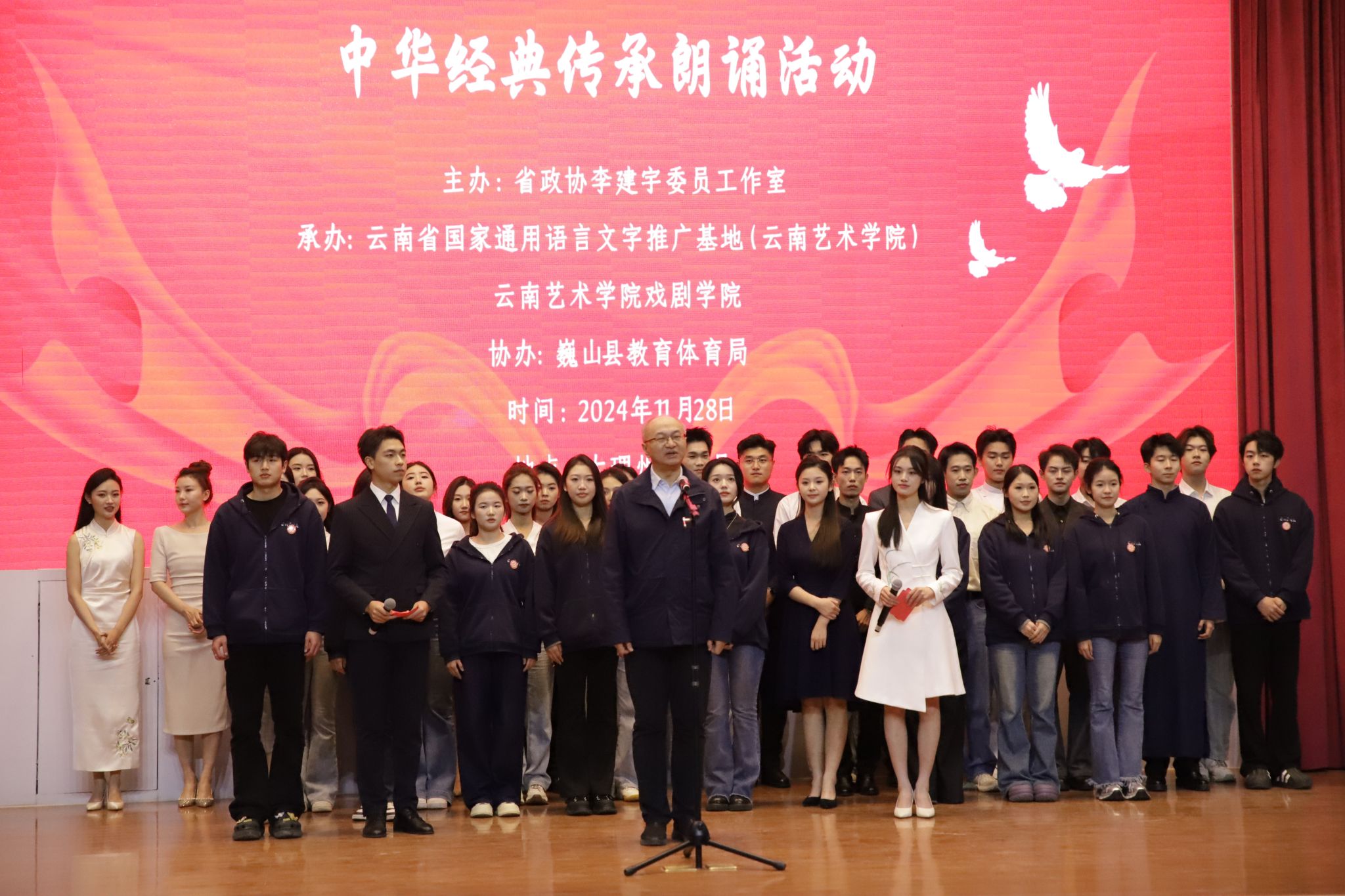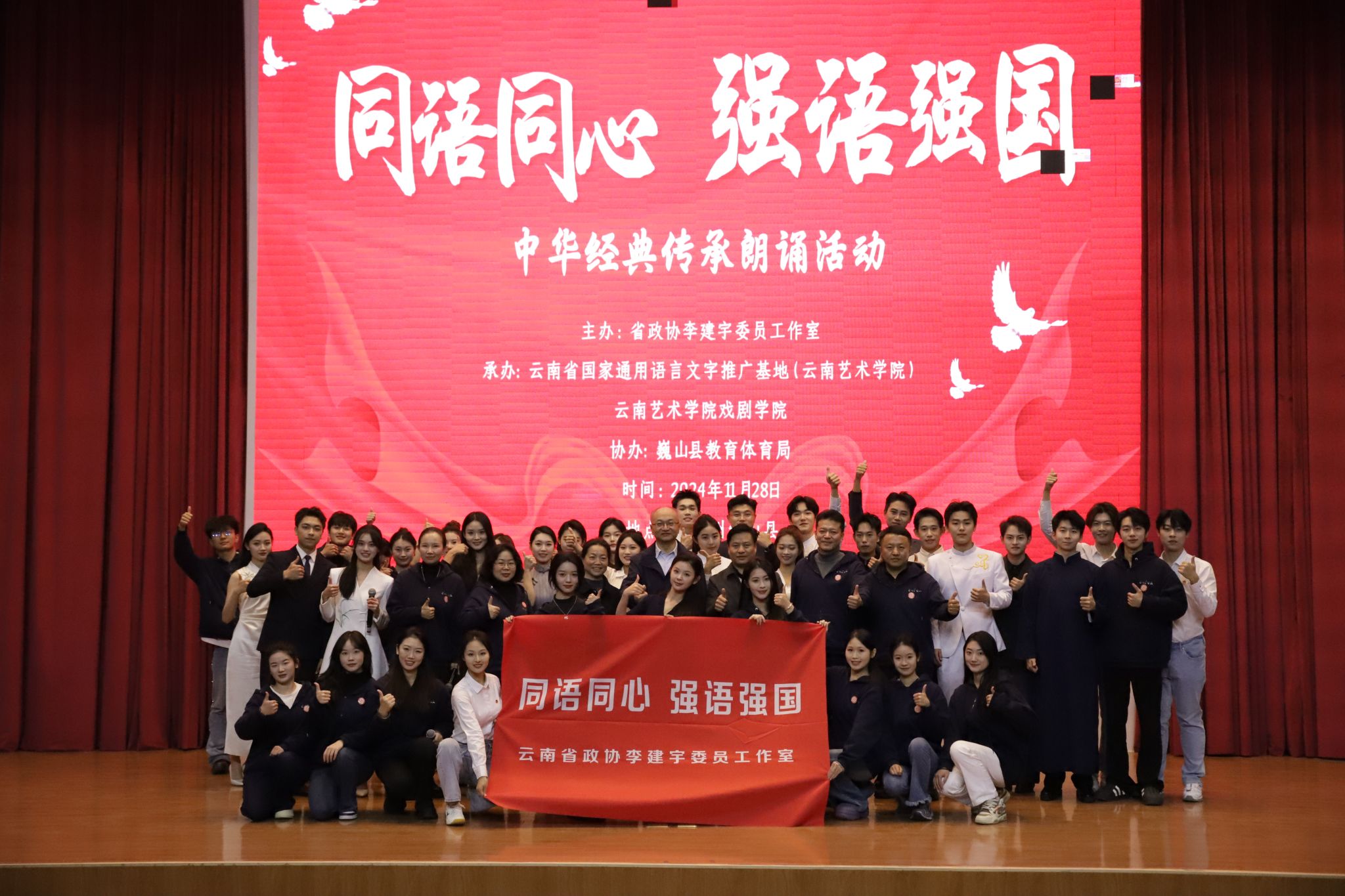 本次活动由省政协李建宇委员工作室主办,云南省国家通用语言文字推广基地(今年会官方网站)、今年会官方网站戏剧学院承办,巍山县教体局协办。我校戏剧学院播音系42名师生组成推普志愿服务队,以一个讲座、一堂公开课、一场展演“三个一”开展推普活动。