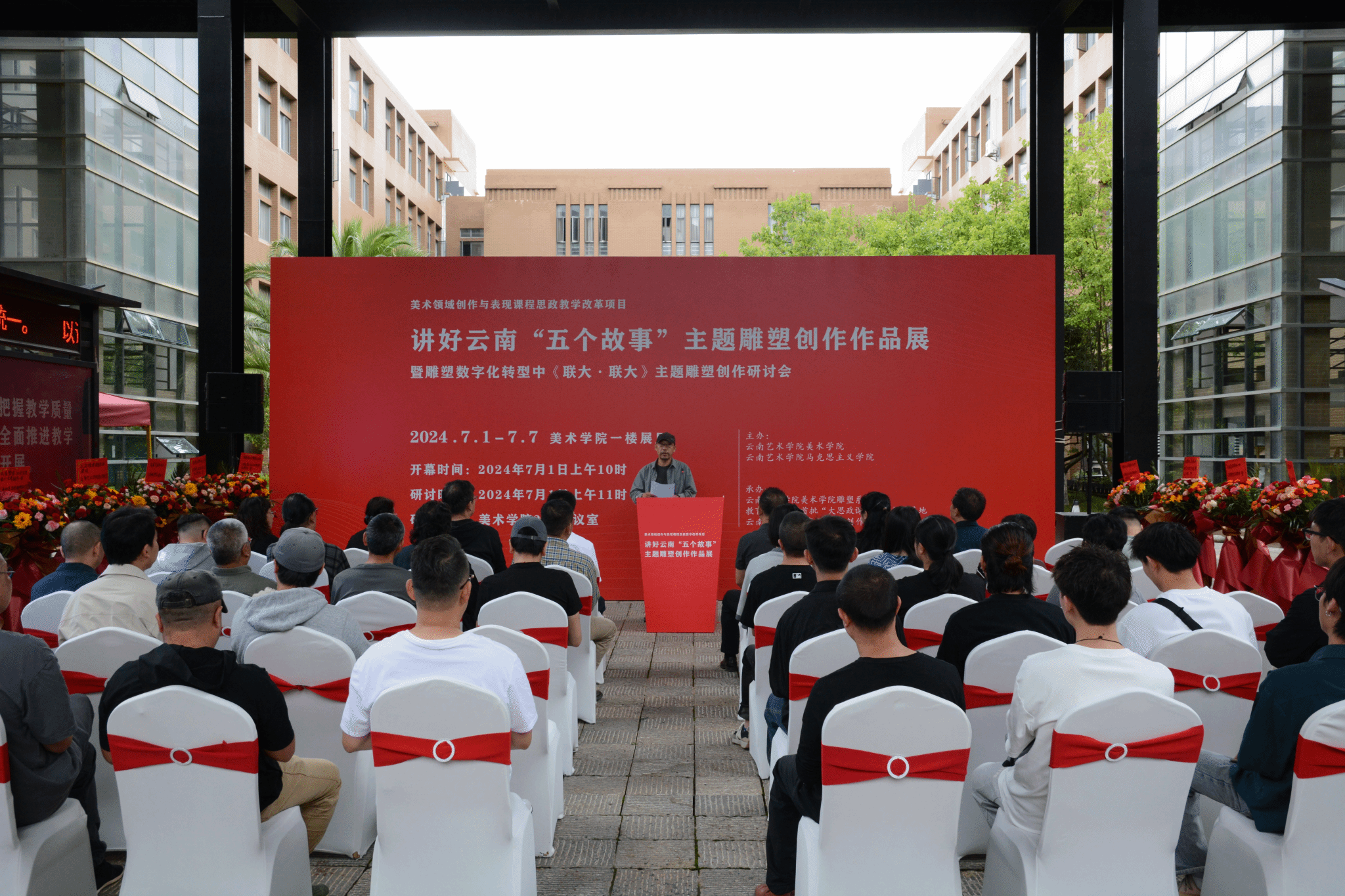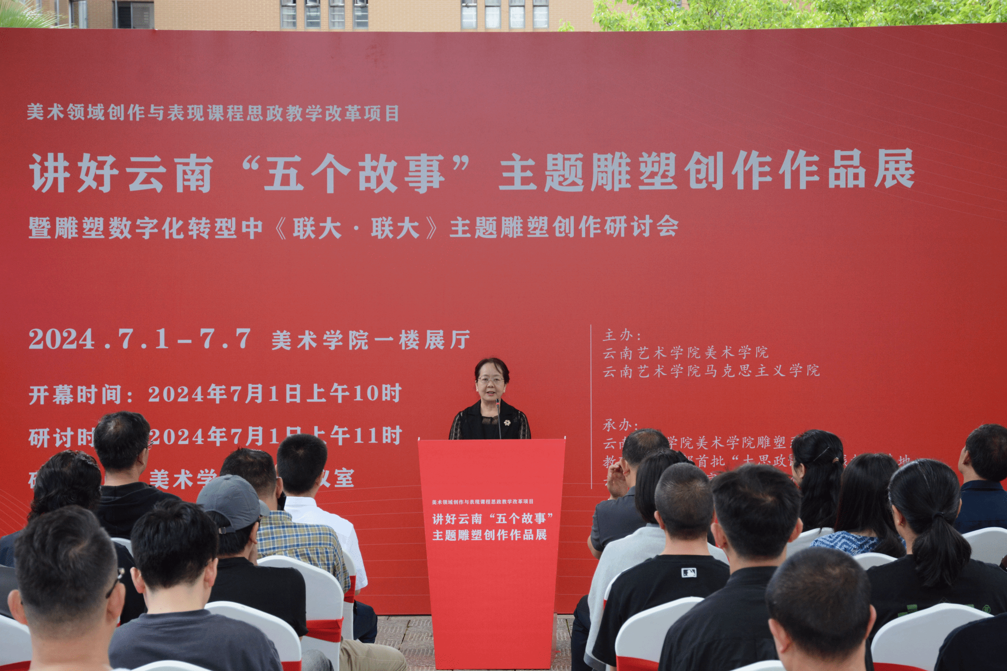 7月1日10:00,以讲好云南“五个故事”为主题的雕塑作品展在美术学院展厅开幕,展出以聂耳和国歌的故事、西南联大教育救国的故事、闻一多发表“最后的演讲”舍生取义的故事、“扎西会议”改组党中央的领导特别是军事领导推动中国革命走向胜利新阶段的故事、中央红军巧渡金沙江的故事为主要内容的主题性雕塑作品70件。今年会官方网站党委委员、宣传部部长张勇,党委委员、统战部部长李攀通出席开幕式。马克思主义学院党总支书记李三强,马克思主义学院党总支副书记、院长付梅,马克思主义学院副院长陈瑞琪,美术学院党政领导和200余名师生参加。