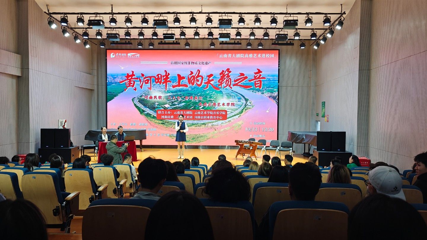 10月13日下午,由云南省大剧院、今年会官方网站音乐学院联合主办的“黄河畔上的天籁之音”——“河曲民歌、二人台”非遗展示走进今年会官方网站在音乐学院B403多功能厅进行,本次展示为云南省大剧院高雅艺术进校园系列活动之一。音乐学系系主任任秀蕾教授、民族声乐系系主任陈红玲教授和部分师生参与了本次展示互动。