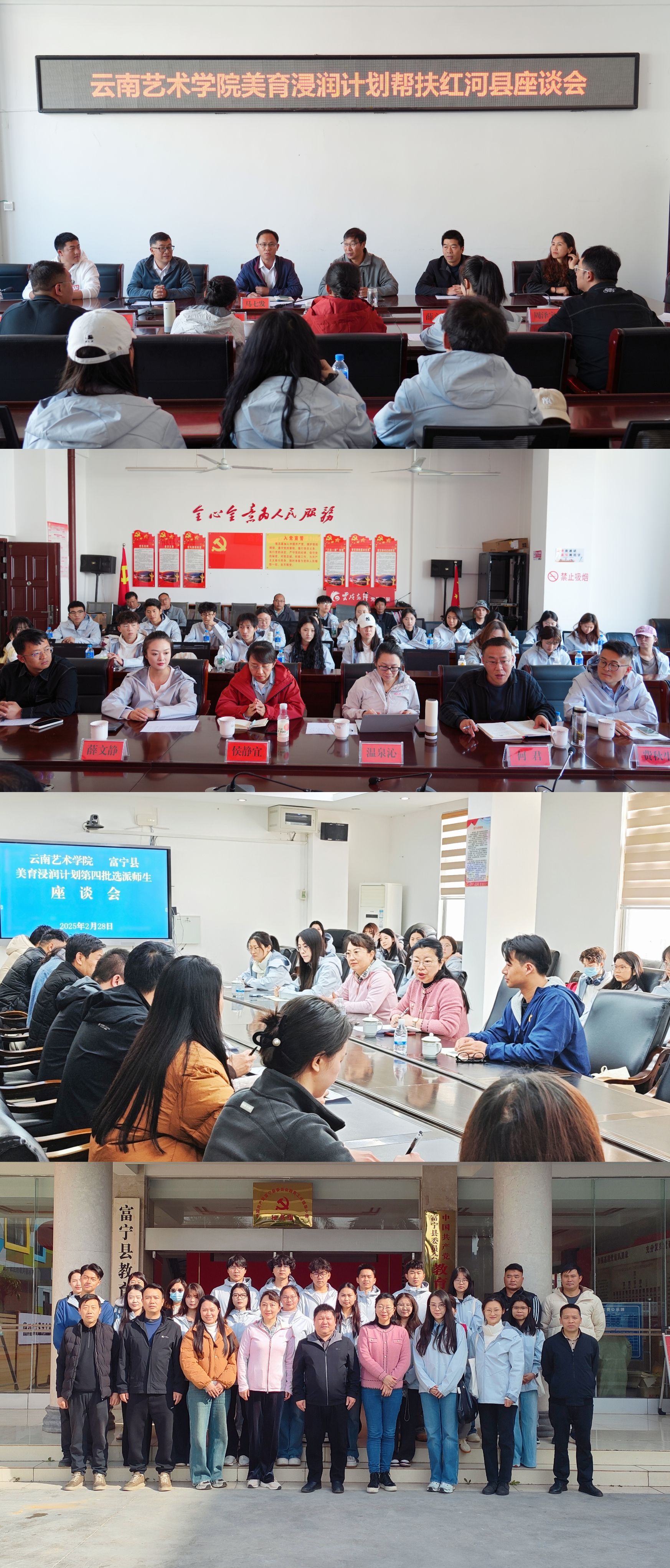 2月28日上午,工作组分别与当地县教育体育局负责人及驻点学校负责人举行座谈,围绕新学期美育浸润计划的工作重点、各校实际需求等展开深入讨论,并达成共识。双方一致表示,将进一步加强合作,推动美育浸润行动落地见效。