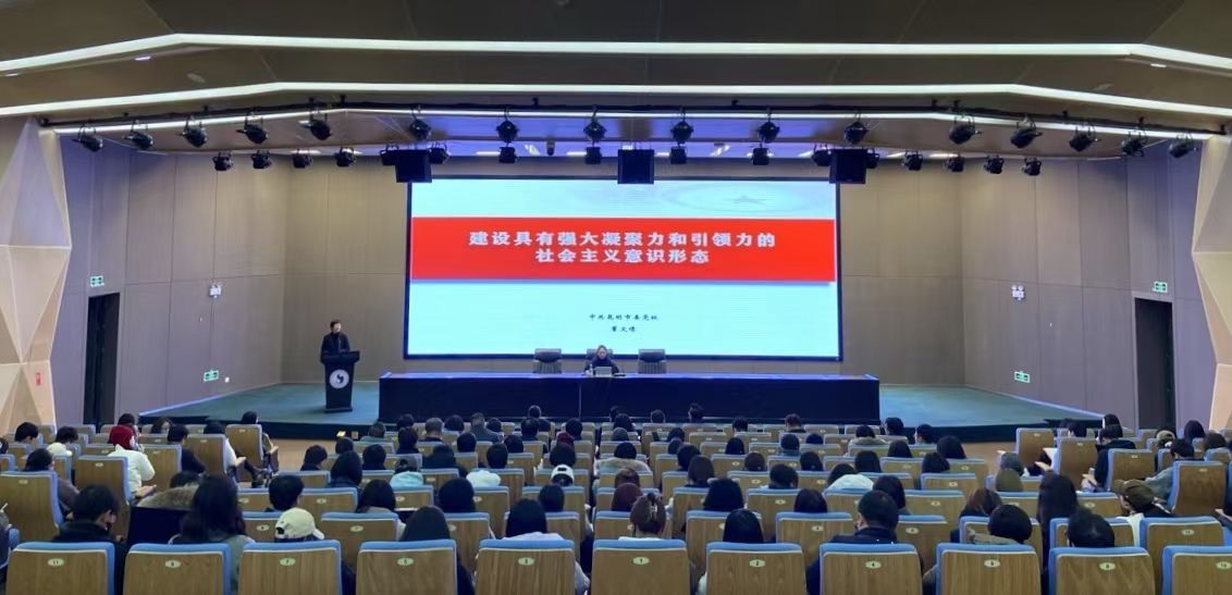 为深入贯彻落实习近平总书记关于意识形态工作的重要论述,推动设计学院意识形态工作责任制落实到位,加强师生队伍建设,提升师生开展意识形态工作的能力。2025年3月19日下午,设计学院邀请中共昆明市委党校董文倩副教授在学校图书馆报告厅开展意识形态工作专题培训。设计学院党政领导、全体教职工、学生党员、团学干部及网络信息员共计200余人参加培训。培训会由设计学院党委宣传委员王瑛主持。