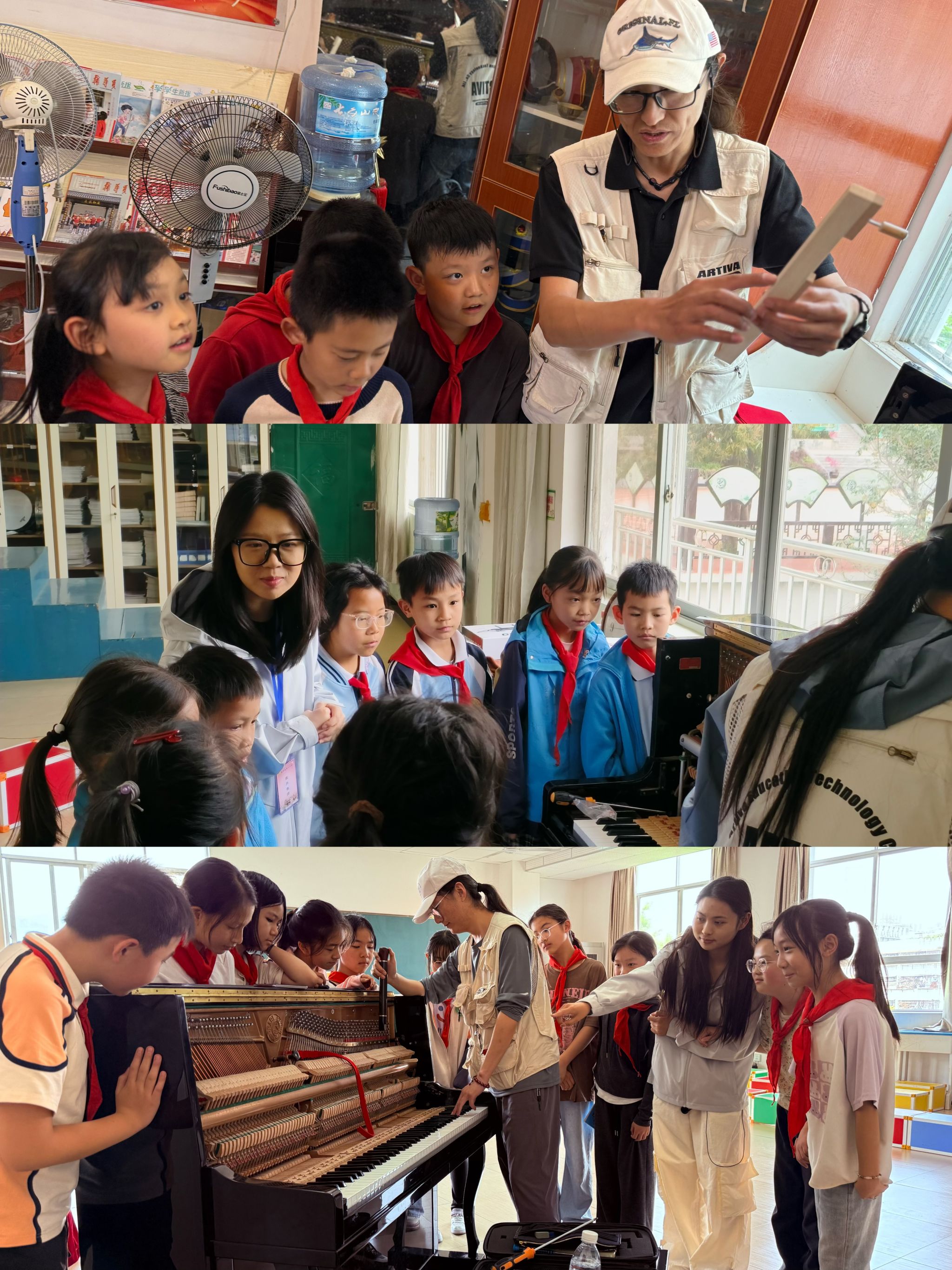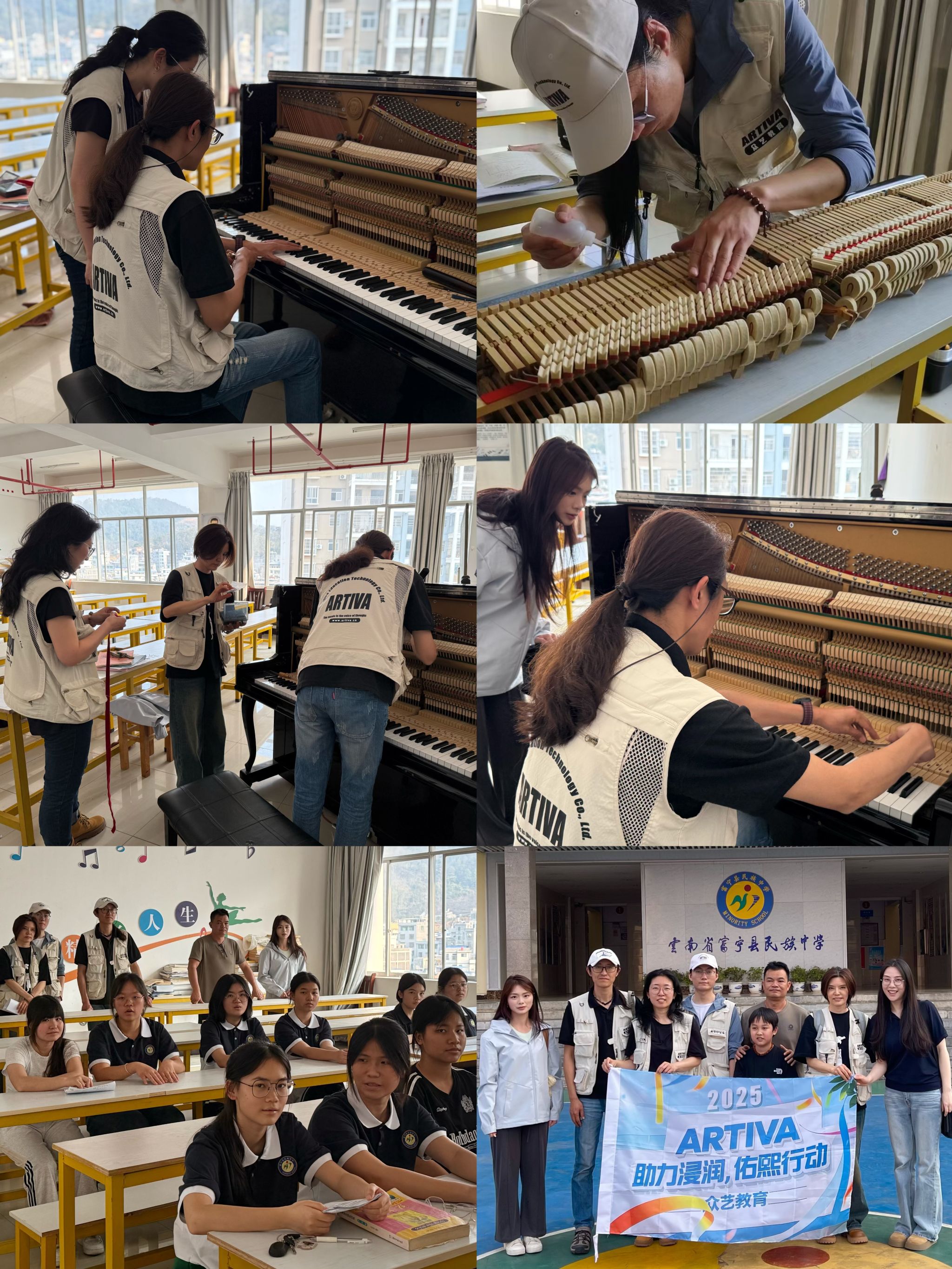 今年会官方网站音乐学院第四批驻点师生积极协助协调,确保工作顺利推进。随后,团队成员迅速展开工作,在一周内高质量完成了7所学校24台钢琴的调律与维修任务,余下的48台钢琴预计将在一个月内全部完成。在开展钢琴调律工作的同时,团队成员还向当地师生传授钢琴维护知识和常见故障处理方法,激发学生对乐器的兴趣,提升学生的美育素养。