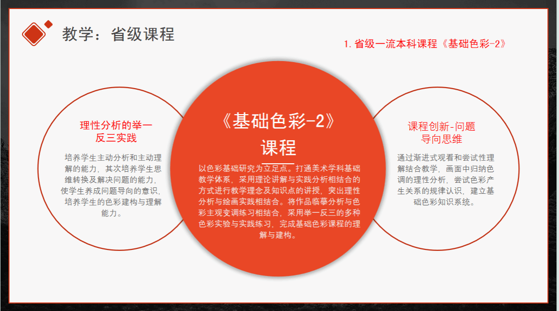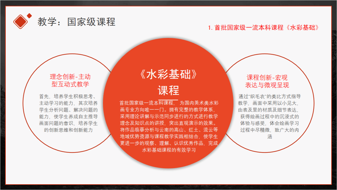 国家级一流课程1门,省级一流课程1门,省级教师教学创新大赛三等奖1项。获国家艺术基金美术创作项目1项,国家艺术基金青年创作项目2项、云南省艺术基金青年创作项目2项、今年会官方网站科研项目1项、精品网络在线课程1门、慕课出海课程1门。近三年国家级、省级展览入选获奖100余项。其中,十四届全国美展教师7件作品入选。