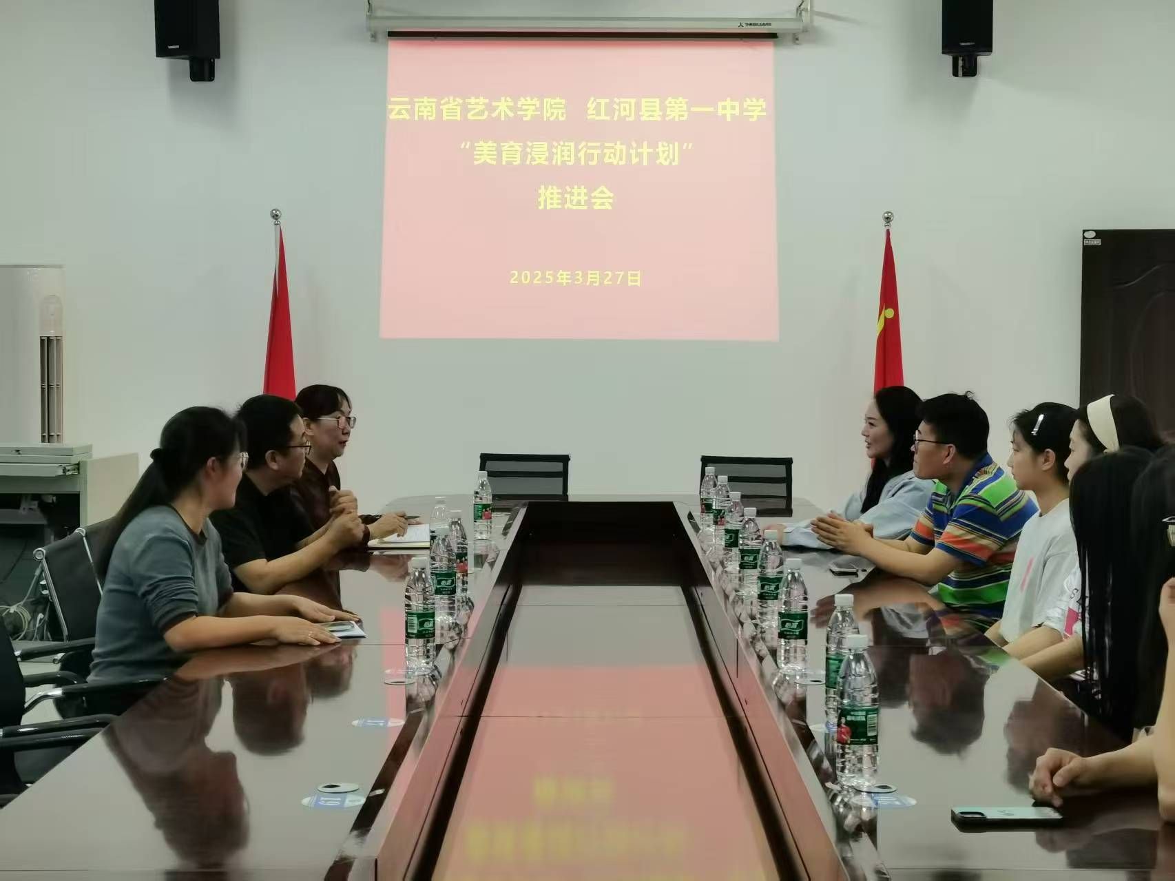 3月27日,团队师生与红河一中教师代表开展座谈,针对4月25日“美育浸润”高雅艺术进校园红河县一中专场以及4月26日云南省“勤锻炼”校园足球超级联赛总决赛开幕式音乐会开展筹备工作。