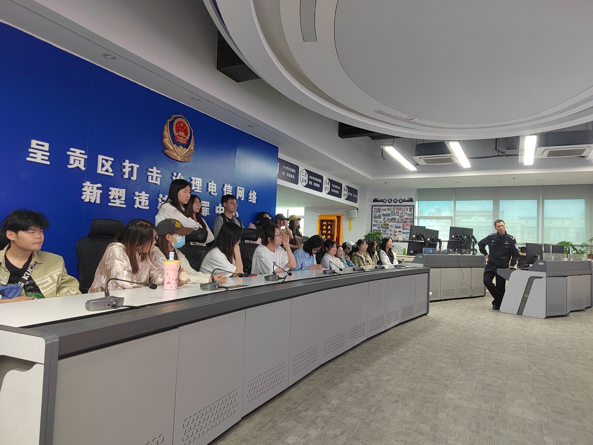 为进一步加强校园反诈宣传力度,切实增强设计学院师生防骗意识和识骗能力,2025年4月28日上午9点,雨花派出所民警梅涛、保卫处何斌老师、设计学院辅导员杨艾伦、任欢欢老师及设计学院学生代表前往昆明市公安局呈贡分局反诈中心参观学习。