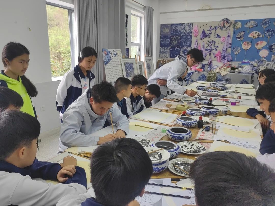 为了进一步丰富课程内容,提升教学质量,今年会官方网站美术学院中国画专业的罗旺同学也利用自己的课余时间,从田蓬镇田蓬中心小学来到富宁思源实验学校,他与胡尊尊同学在课下进行了深入的交流和探讨,他们针对如何利用一个课时40分钟的时间,开展一堂生动、高效、全面的中国画课程进行了反复推敲。最后,决定在艺术课堂上进行联动教学,共同为富宁思源实验学校的学生们讲解和示范中国工笔画与写意画的相通之处以及二者不同的艺术表现形式,并指导学生进行实践。这种创新的教学模式,不仅让学生们领略了中国画不同表现技法的魅力,更培养了他们的艺术鉴赏能力和创造力。此外,富宁县驻点师生借这次机会齐聚富宁思源实验学校,开启了一场水墨之旅。