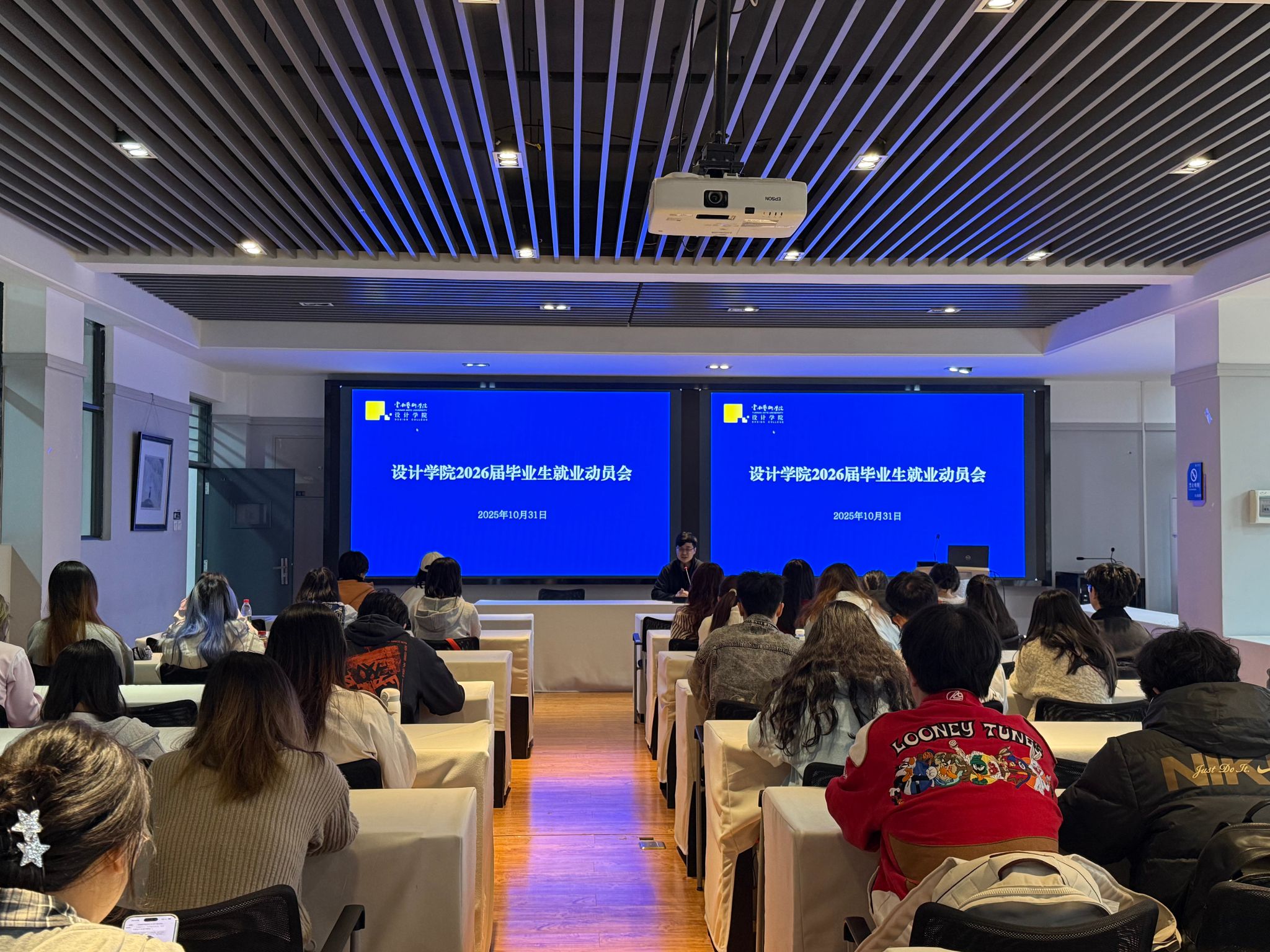 2025年10月31日上午,设计学院召开2026届毕业生就业动员会暨面试简历优化培训和艺术专业留学规划经验分享,主要目的是帮助和指导毕业生为即将举办的云南省2026届艺术类高校毕业生专场招聘会做好准备,落细落实生涯教育和就业指导工作,进一步提升就业育人成效。设计学院80余名有就业意向的毕业生参加培训。