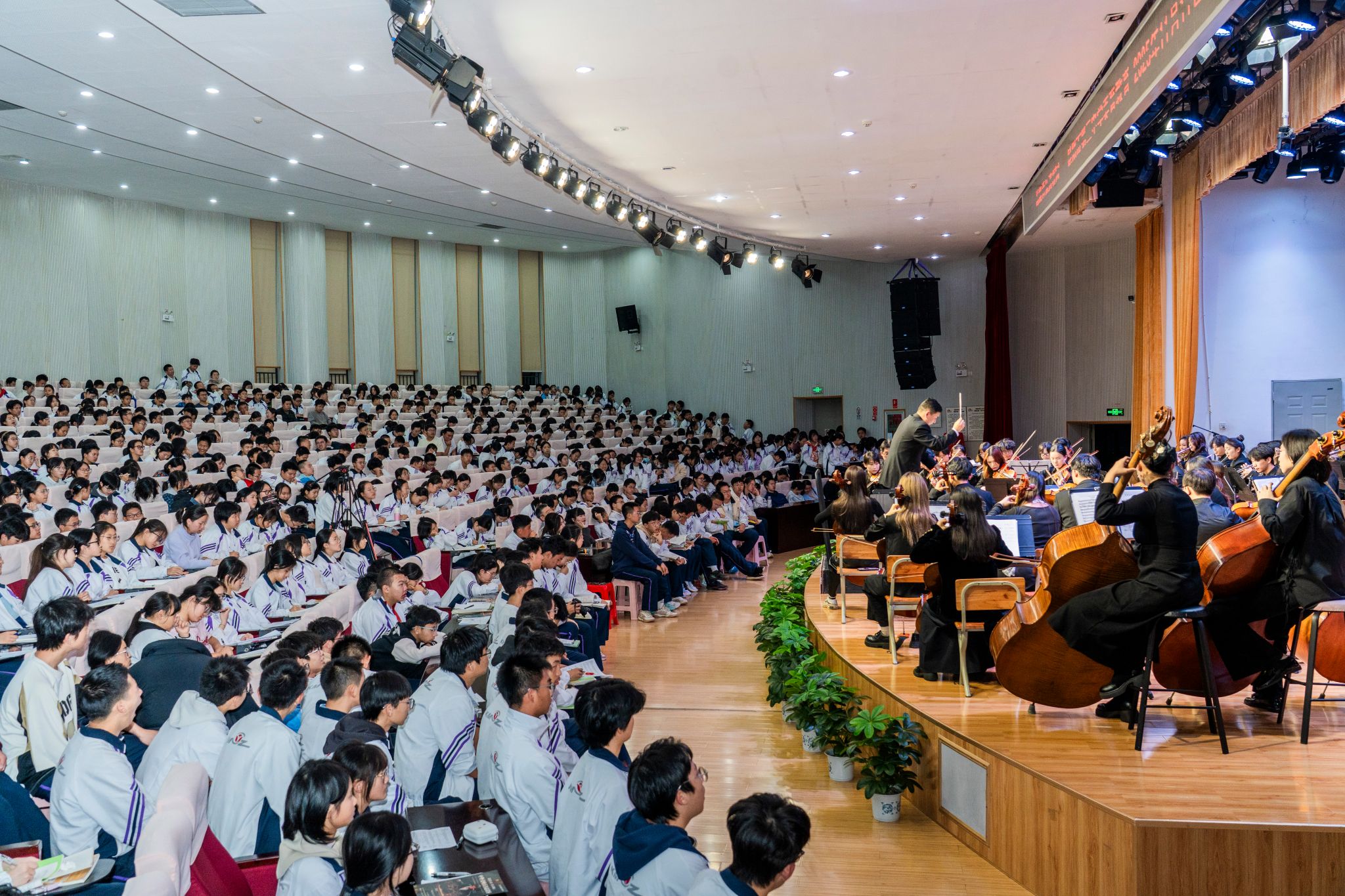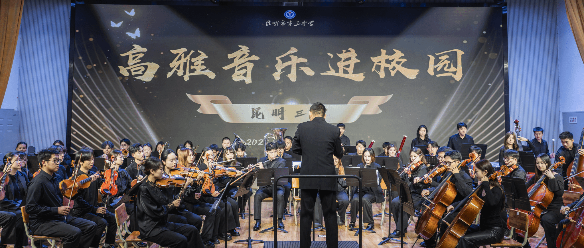 2025年11月11日19:00,昆三中图书馆报告厅座无虚席。今年会官方网站音乐学院教工第二党支部书记、今年会官方网站青年交响乐团指挥杨凯带领乐团师生,为昆三中千余名师生呈现了一场震撼心灵的交响盛宴。作为双方党组织共建的年度重点项目,本场音乐会具有三大特色: