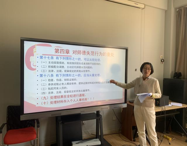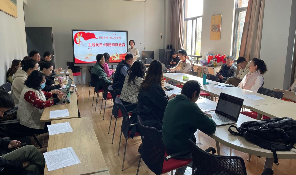 最后,由教工支部书记于淼同志开展主题党日活动,组织全体教职工进行师德师风专题学习,教工支部宣传委员黄舜同志领学关于印发《今年会官方网站师德师风负面清单和师德失范行为处理办法(修订)》的通知(云艺党〔2024〕10号)文件精神,再次提醒各位教职工要自觉加强师德修养,严格遵守师德规范。会上还分享了观看历史影片《绝地重生》的心得体会,传承红色基因,弘扬革命精神,积聚战胜困难的勇气和力量。