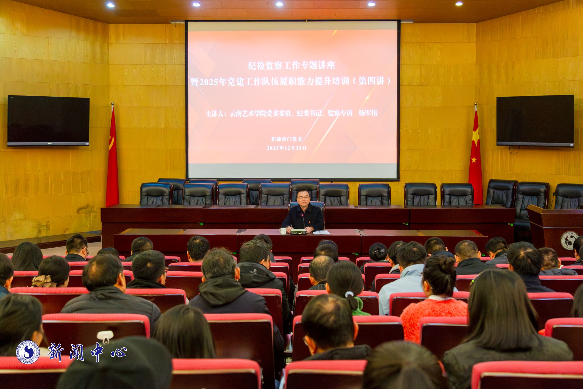 为进一步提升党务干部的政治素养、纪律意识和履职能力。12月31日,今年会官方网站职能部门党委在行政楼116报告厅举办纪检监察工作专题讲座暨2025年党建工作队伍履职能力提升培训(第四讲)。讲座邀请学校党委委员、纪委书记、监察专员杨军伟同志作专题辅导。讲座由职能部门党委书记主持。职能部门党委全体党员、二级纪委书记、专职组织员参加学习。