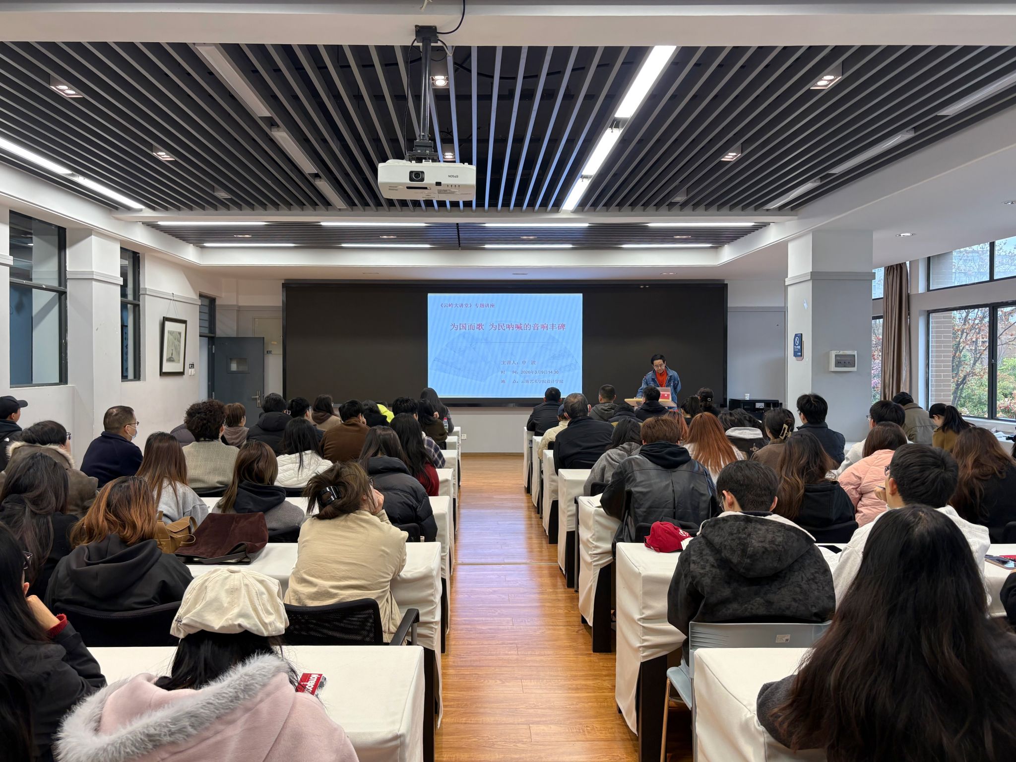 申波教授通过珍贵史料解读与聂耳作品赏析,系统梳理了人民音乐家聂耳的成长历程、求学经历与音乐实践探索。他以音乐学的专业视角结合丰富视听资料,剖析了聂耳音乐技法的习得、创作价值的定位,展现其将音乐创作与民众需求、民族命运紧密结合的艺术追求。在作品赏析环节,申教授以“音本体”解读《义勇军进行曲》《金蛇狂舞》等经典,阐释其作曲技艺与精神内涵,彰显聂耳“为国而歌、为民呐喊”的家国担当,其作品已成为中华民族共有的精神丰碑。讲座最后,他带领大家齐唱《义勇军进行曲》,共同感受聂耳事迹与作品中炽热的家国情怀与磅礴的奋进力量。