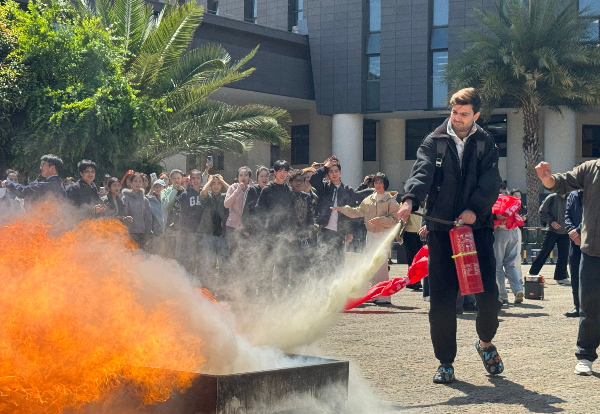 本次活动紧扣“实战化、实操性”,分两大环节有序推进。在5号教学楼综合应急疏散演练中,模拟教学时段突发火情,全体师生严格按照演练方案,快速响应、规范避险、有序撤离,全程高效顺畅。在消防实操培训环节,呈贡区消防大队指战员现场讲解消防器材使用方法,并手把手指导师生开展灭火体验,将理论知识与实操技能紧密结合,有效强化了师生消防安全意识和应急实操能力。
