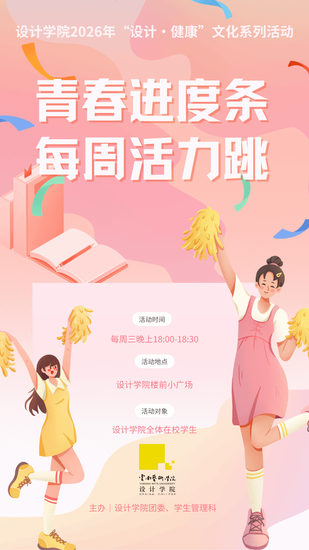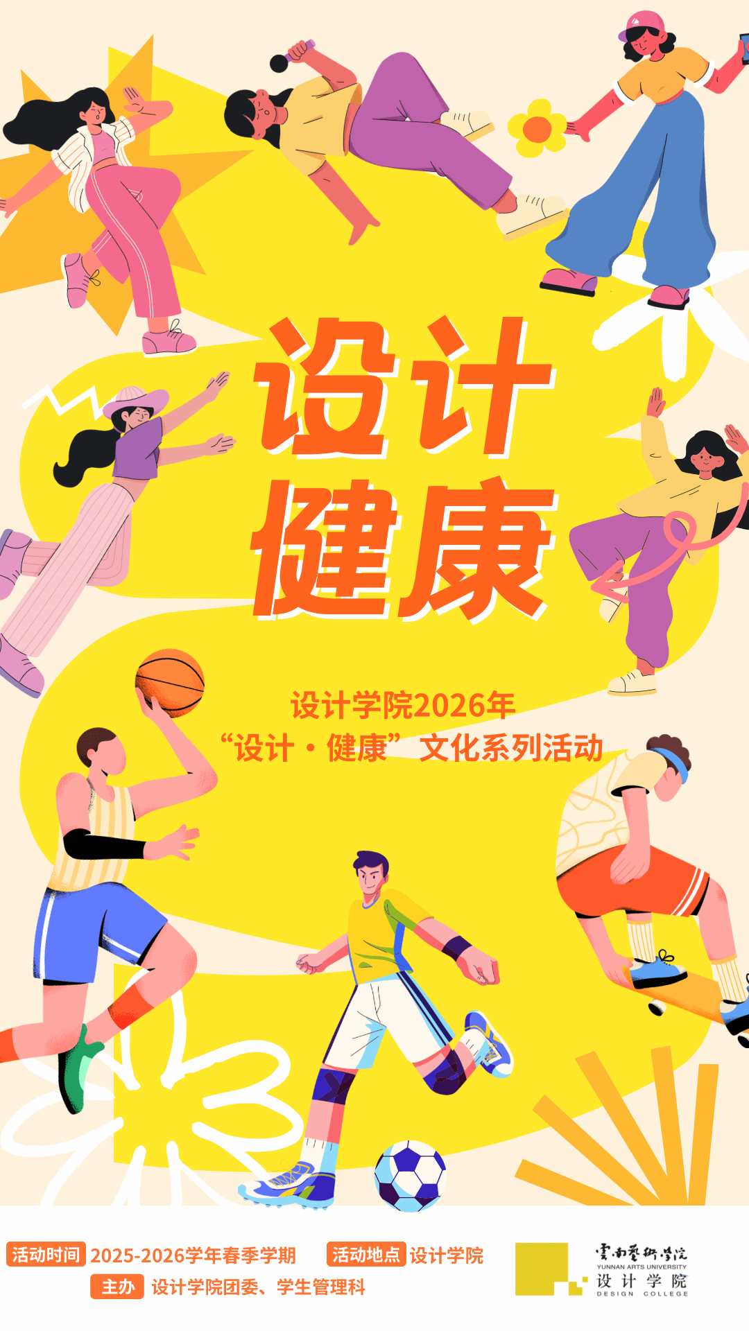 为深入贯彻落实教育部关于健康学校建设的部署要求,切实将学生身心健康摆在育人工作突出位置,设计学院立足学生久坐绘图、用眼强度高等专业特点,认真组织2026年“设计·健康”文化系列活动,开展以规律运动为载体的健康促进活动,推动形成“人人参与、每周坚持”的健康氛围。