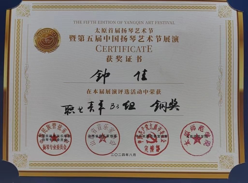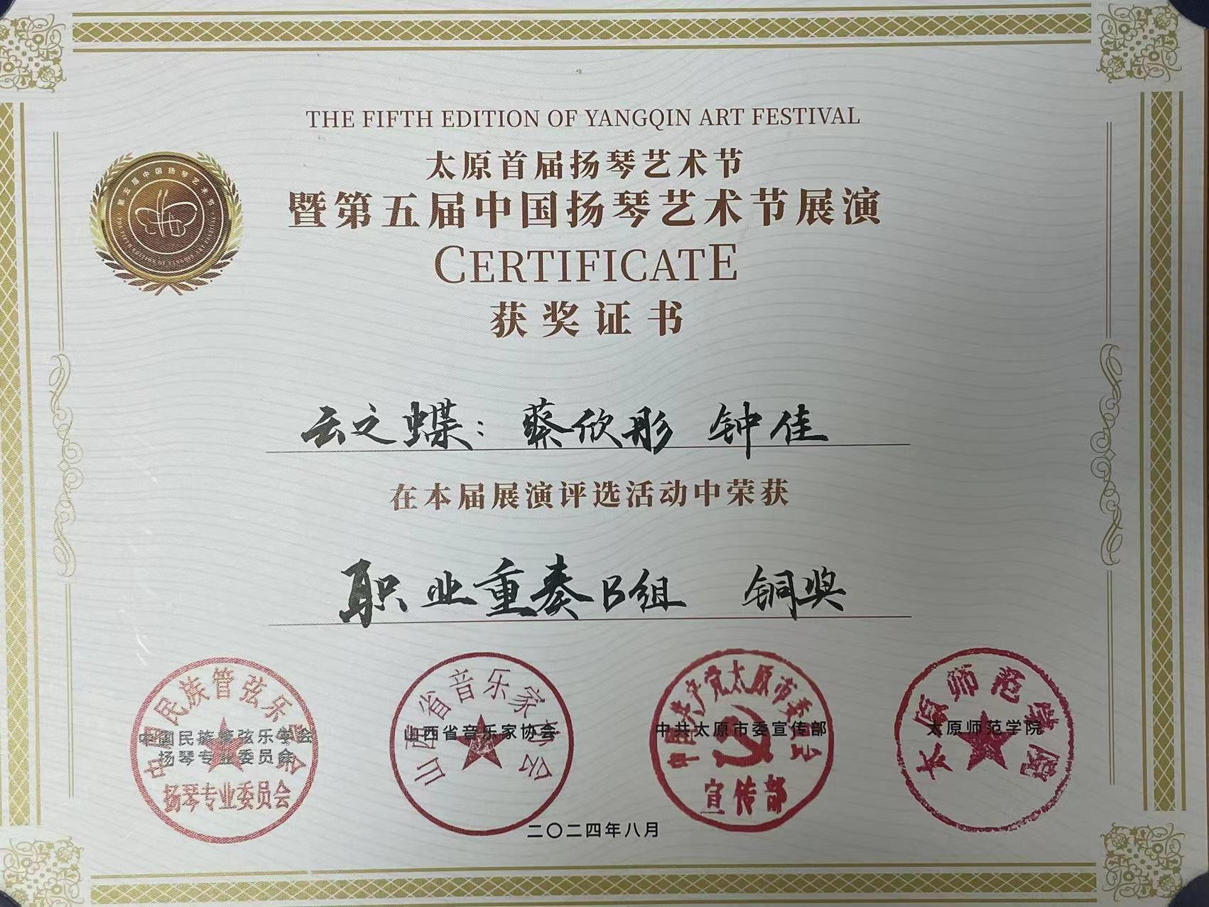 2024年7月29日至8月2日,由中国民族管弦乐协会扬琴专业委员会、山西省音乐家协会、太原市委宣传部主办的太原首届扬琴艺术节暨第五届中国扬琴艺术节展演在太原举行。音乐学院国乐系系主任王静教授带领扬琴专业学生参与了此次展演。2023级研究生蔡欣彤、2023级本科学生钟佳组成的“云之蝶”组合获职业独奏B组铜奖,钟佳获职业青年B3组铜奖。