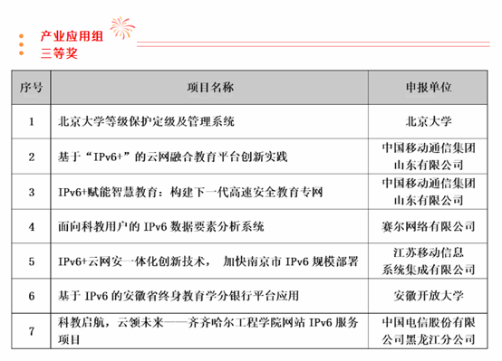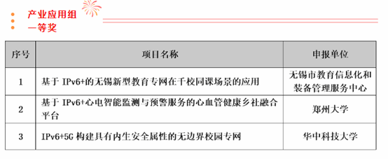2022年,由工信部、中央网信办、教育部共同指导的“首届IPv6技术应用创新大赛“成功举办。按照教育部安排,”下一代互联网技术创新大赛“正式纳入IPv6技术应用创新大赛,作为大赛的”科教赛道“。本届大赛科教赛道包含“高校创新”和“产业应用”两个组别,产业应用组旨在促进基于IPv6的智慧教育创新研究及实践,推动赛事成果转化和产学研用紧密结合。本次决赛共入围61组项目,包括高校网络关键技术组:18个;高校行业应用服务组:27个,产业组:16个。参赛44所高校覆盖全国19个省、自治区,直辖市,其中“双一流”、985、211高校20所,32个项目入围决赛,分别占比达45%和52%。