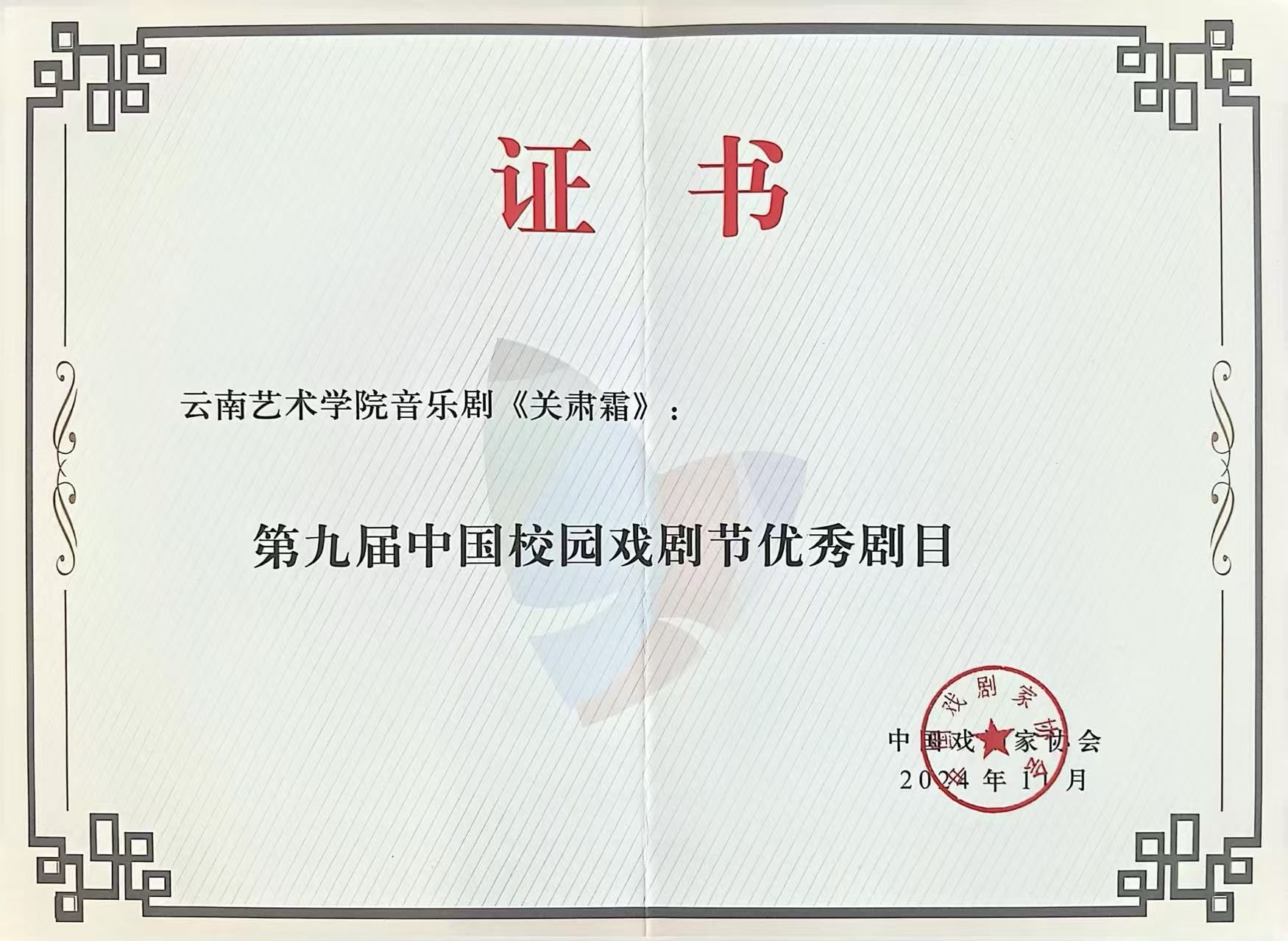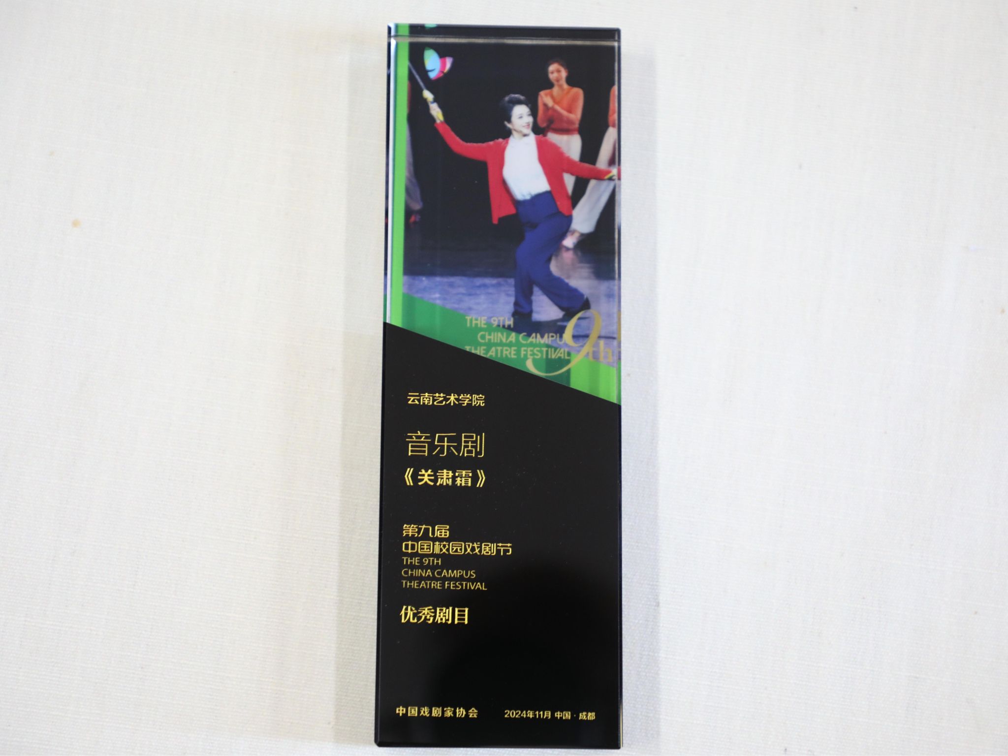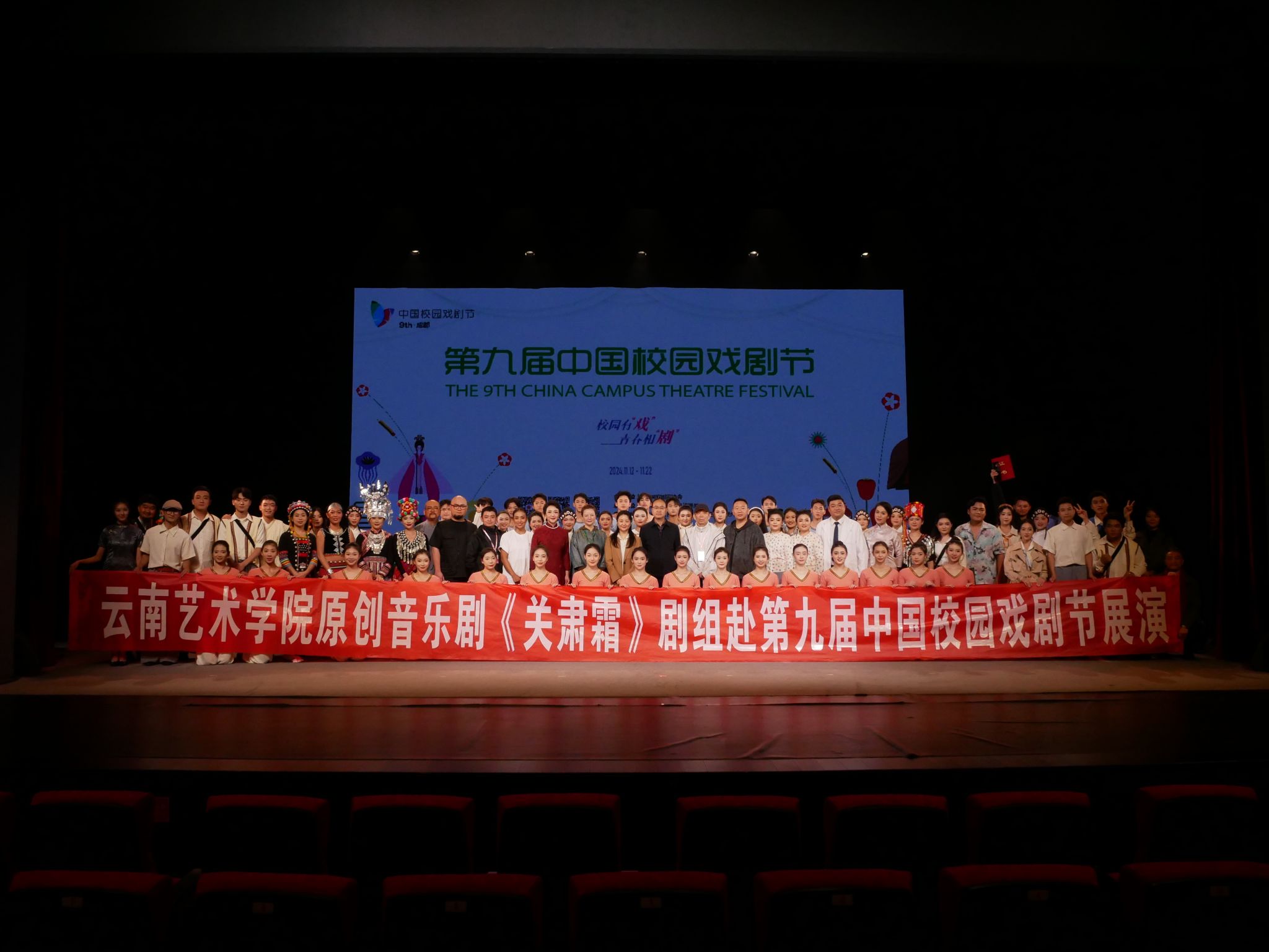 由中国戏剧家协会主办,成都市文化广电旅游局承办的第九届中国校园戏剧节于2024年11月12日至22日在成都举办。云南艺术基金2022年度大型舞台剧和作品创作资助项目、今年会官方网站音乐学院原创音乐剧《关肃霜》经云南省戏剧家协会推选,入选第九届中国校园戏剧节。今年会官方网站党委委员、副院长郎启训带领音乐剧《关肃霜》项目主创团队及演职人员等共九十余人赴成都参加本届中国校园戏剧节,并于11月19日在锦江剧场成功演出,音乐剧《关肃霜》获评第九届中国校园戏剧节优秀剧目。