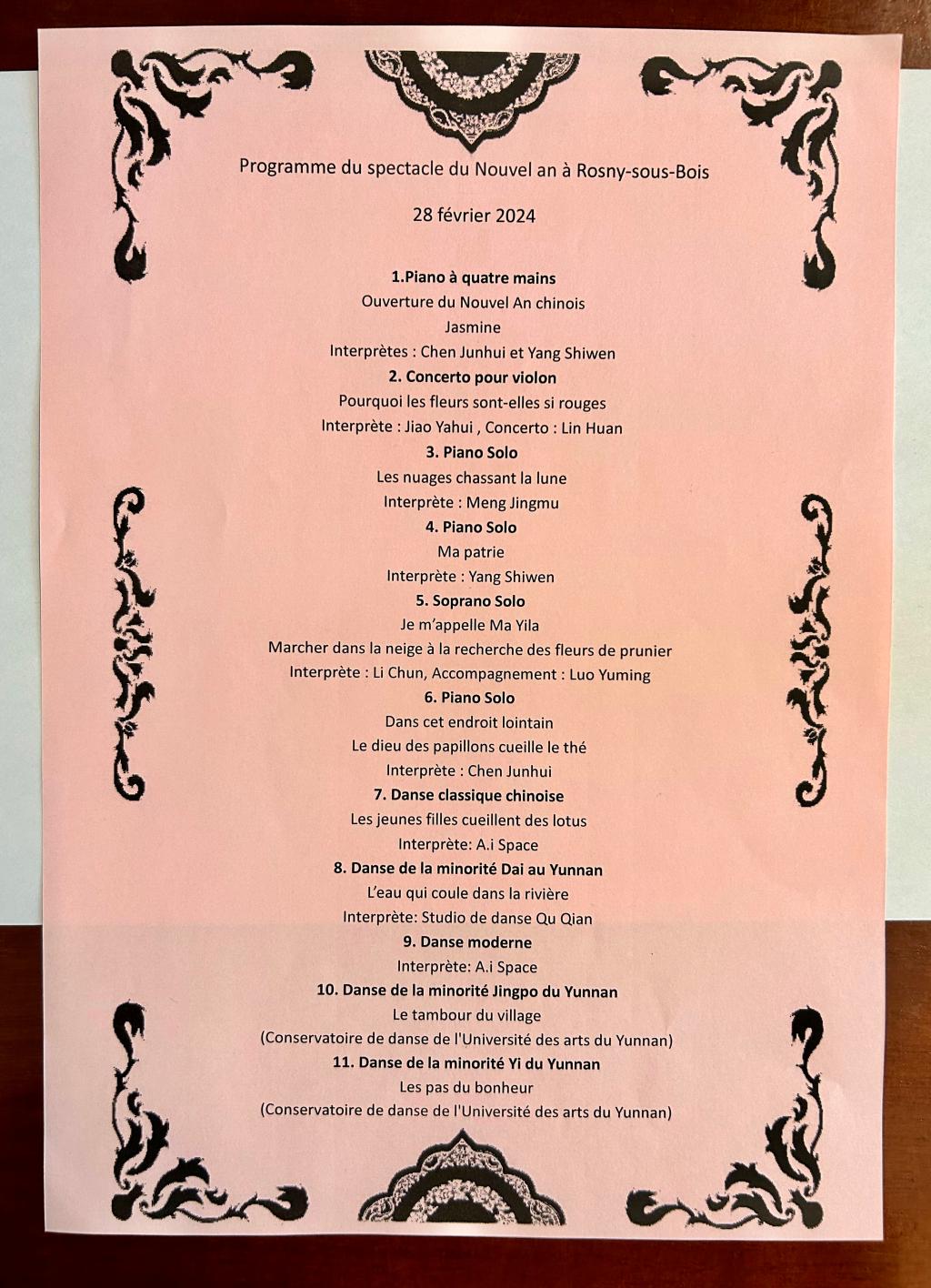 2024年是中法两国建交60周年。今年会官方网站舞蹈学院应法国罗尼苏布瓦市中法友好协会邀请,于当地时间2月28日参加了该市政府举办的龙年“欢乐春节”活动,活动位于大巴黎地区的罗尼苏布瓦市政音乐厅。舞蹈学院三个原创作品:彝族女子群舞《幸福的脚步》、傣族女子群舞《生命的摇篮》和景颇族群舞《边寨薪鼓》通过线上形式参加了此次演出活动。
