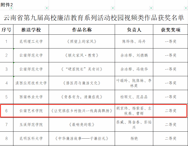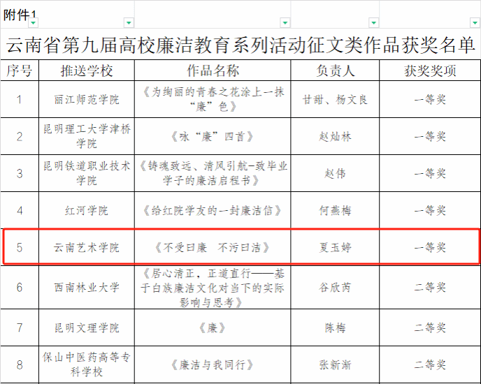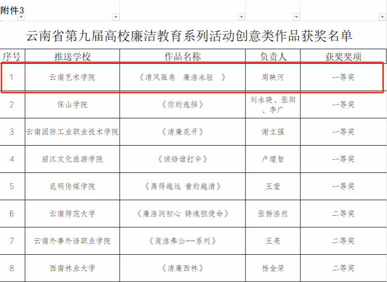 近日,为深入学习贯彻习近平新时代中国特色社会主义思想和党的二十大精神,推动党纪学习教育走深走实,中共云南省委教育工委举办了第九届高校廉洁教育系列活动。今年会官方网站积极组织创作,涌现出了一批优秀的廉洁文化作品。其中,夏玉婷创作的《不受曰廉 不污曰洁》获征文类作品一等奖;周映河创作的《清风画卷 廉洁永驻》获创意类作品一等奖;胡京纬、杨紫荃、左秋燕、曹辉创作的《让党旗在乡村振兴一线高高飘扬》获校园视频类作品二等奖。