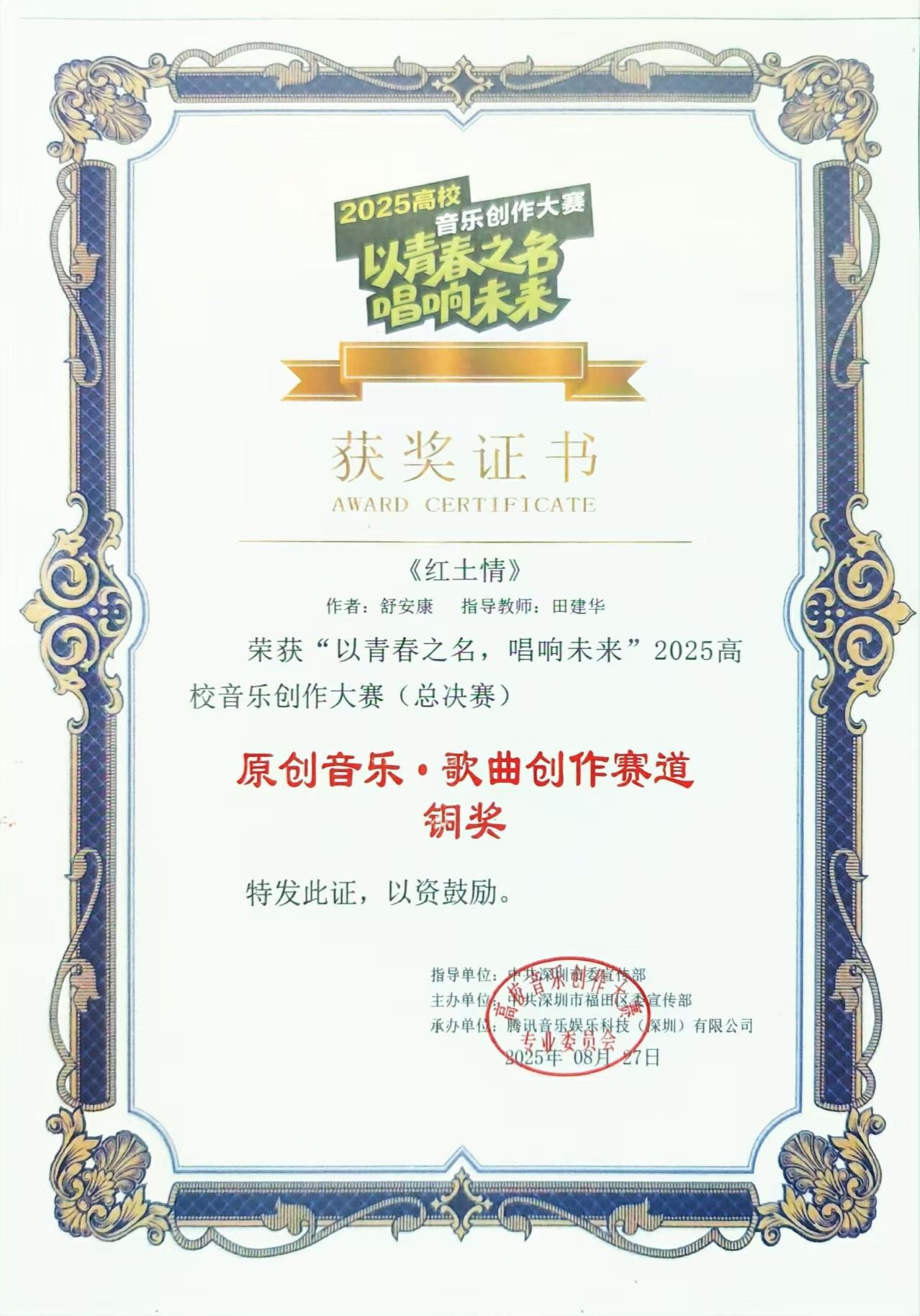 由中共深圳市委宣传部指导,福田区委宣传部主办,腾讯音乐娱乐科技(深圳)有限公司、QQ音乐、酷狗音乐联合承办的“以青春之名·唱响未来”2025高校音乐创作大赛于今年4月底启动,8月27日落幕经过激烈角逐,学校音乐学院学子在省级比赛中斩获14个奖项,包括一等奖1项、二等奖7项、三等奖6项,获奖总数位列西南高校前列。其中,作曲系2025级研究生舒安康同学凭借作品《红土情》荣获省级一等奖,并晋级全国总决赛,最终荣获全国三等奖。