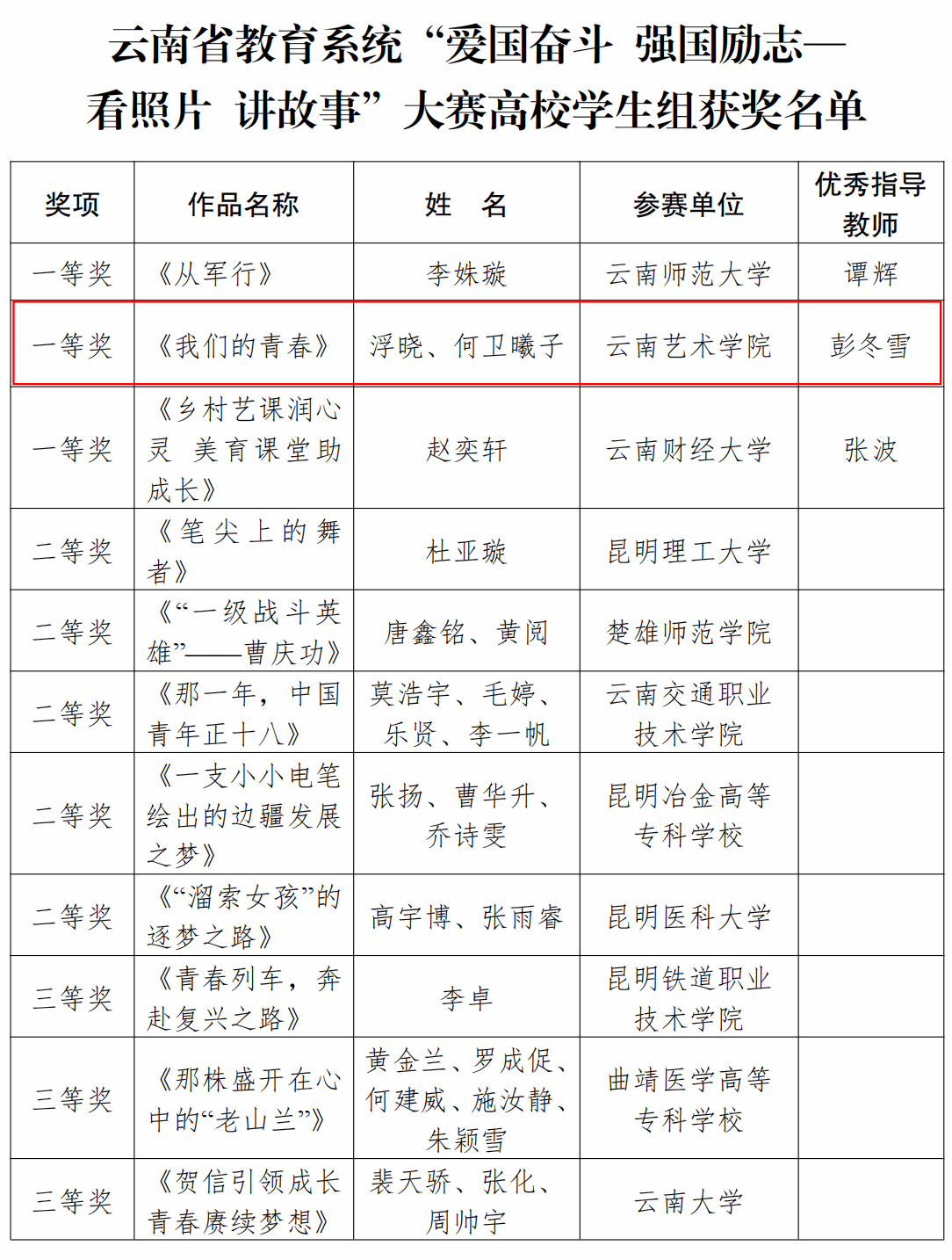 近日,中共云南省委教育工委、中共云南省委精神文明建设办公室公布了 2024 年全省教育系统“爱国奋斗 强国励志—看照片 讲故事”大赛获奖结果,今年会官方网站学子浮晓、何卫曦子作品《我们的青春》获一等奖。