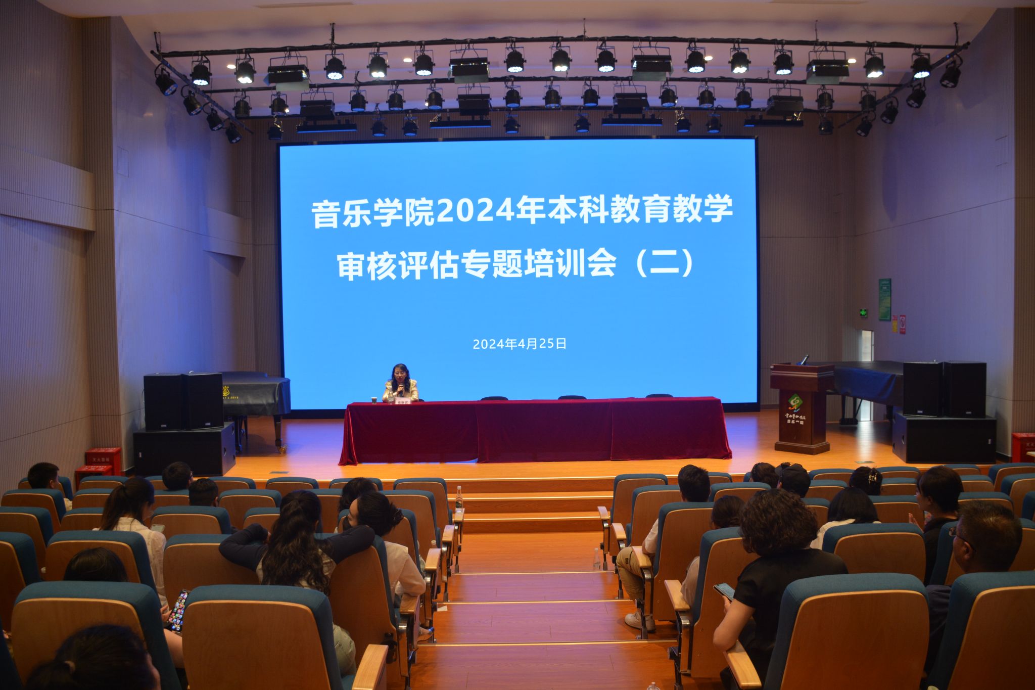 2024年4月25日下午,音乐学院在B403音乐厅开展2024年本科教育教学审核评估专题培训。学院领导班子成员、全体教职工参加培训会议,培训会由副院长侯静宜主持。