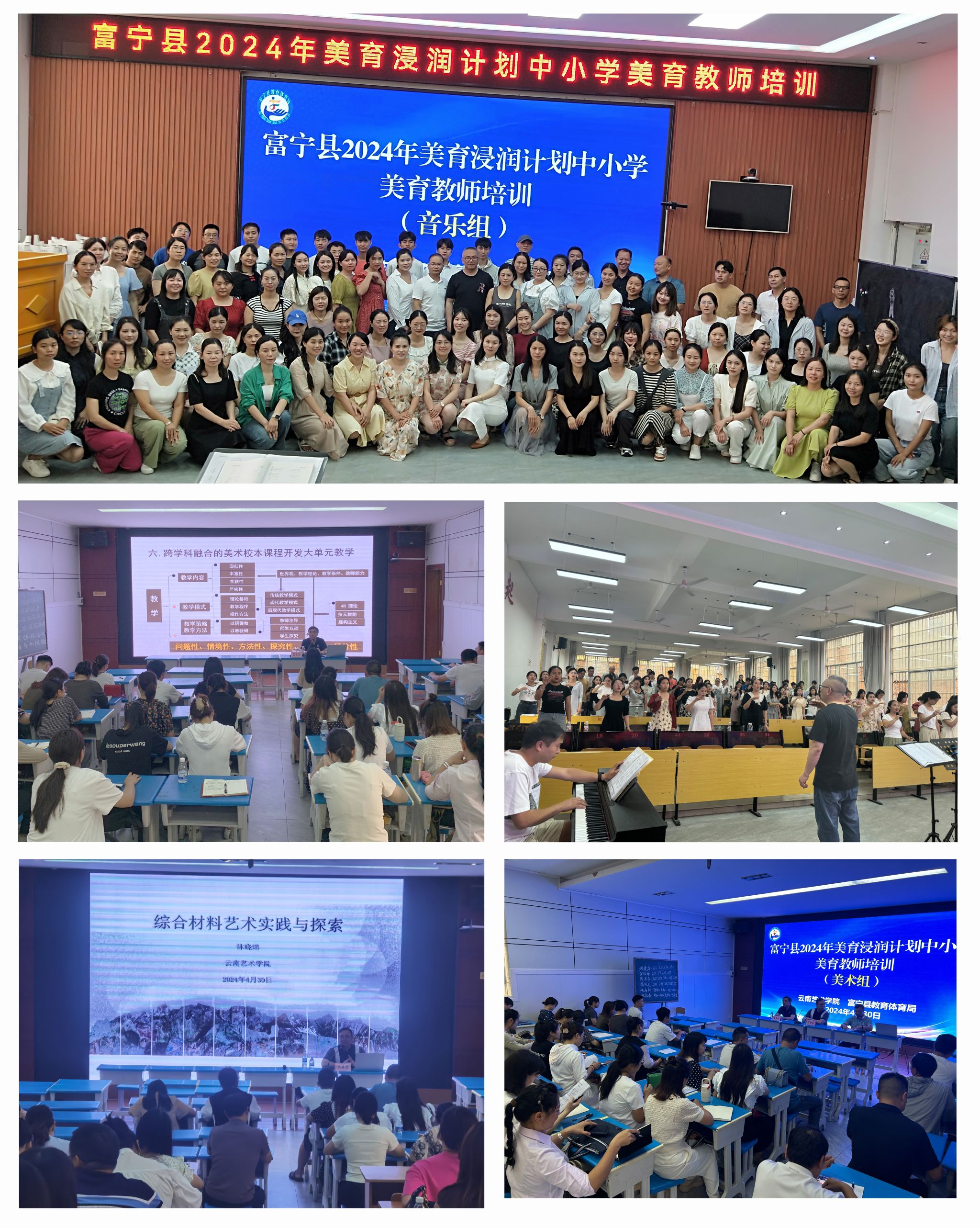 为认真贯彻落实省委办公厅、省政府办公厅印发的《云南省教育高质量发展三年行动计划(2023—2025年)》及云南省教育厅印发的《怒江州迪庆州和边境县学校体育美育浸润行动计划实施方案的通知》要求,持续提高中小学美育教师教学能力。4月30日,我校组织音乐学院合唱系系主任尹伟教授、美术学院美术学副主任沐晓熔教授、云南省“万人计划”教学名师、昆明市美术学科带头人翁滇林老师三位专家到富宁县开展中小学美育教师培训活动。全县共有218名音乐美术教师参加培训。