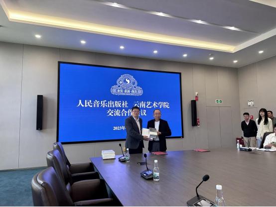 陈劲松副院长代表学校对杜永寿一行表示热烈欢迎。他详细介绍了我院的办学特色、近年来的教学及科研情况,并对未来与人民音乐出版社的合作方向提出了展望。杜永寿总编辑代表人民音乐出版社对我校在人才培养、学科建设、学术研究等方面取得的成果给予了高度评价,向学校赠送了人民音乐出版社最新出版的图书及音像制品,并提出将大力推进双方合作。