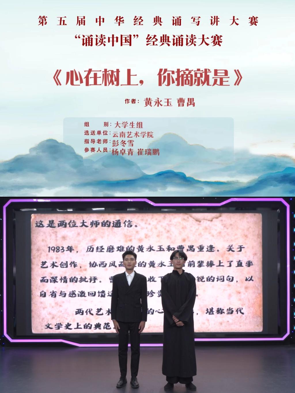 其中,戏剧学院彭冬雪老师获优秀指导教师奖。由戏剧学院报送的四部诵读作品均在“云岭杯”中华经典诵写讲大赛·诵读大赛中喜获佳绩。