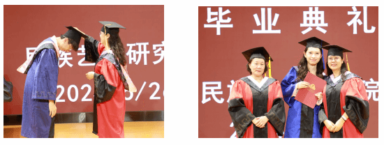 随后,民族艺术研究院党总支书记、院长迟燕琼为每一位毕业生扶正流苏。扶正流苏,是莘莘学子获得学位过程中的经典场景和必要步骤,简单的动作背后寓意的是学子的收获、学脉的传承、学道的光大!