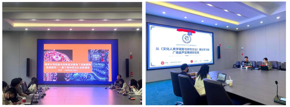 同学们围绕本次读书会主题进行了热烈的讨论。肖寒同学结合《文化人类学调查与研究方法》,提出了自己硕士论文的选题《铸牢中华民族共同体意识视角下苗族银饰传承研究》的基本设计,并分享了田野设计方案与论文的基本框架设想。马竞同学将自己去文山苗族壮族自治州广南县考察芦笙舞的田野实践与大家分享,并据此指出《文化人类学调查与研究方法》更像是一本“田野调查说明书”,从中学到很多实用性知识,例如田野调查与选题设计,选题应该注意的问题,进行田野调查的阶段等。石洋同学则对《文化人类学文化人类学调查与研究方法》一书中所提出的“内容创新”这一章节表达了自己的困惑,结合他自己的田野实践,他认为当前对非遗研究缺乏新意。高珊同学就田野调查的内容如何更好地融入论文写作,提出了自己看法与问题。参会的各学院各年级的同学对分享人的观点从艺术本体、理论视角、田野实践、研究新意以及民族文化等各视角进行充分的交流与讨论,展现出浓郁的学术氛围。例如,舞蹈学院2021级研究生闫二转同学从舞蹈的本体视角对马竞同学分享的“芦笙舞”田野实践进行提问与交流。