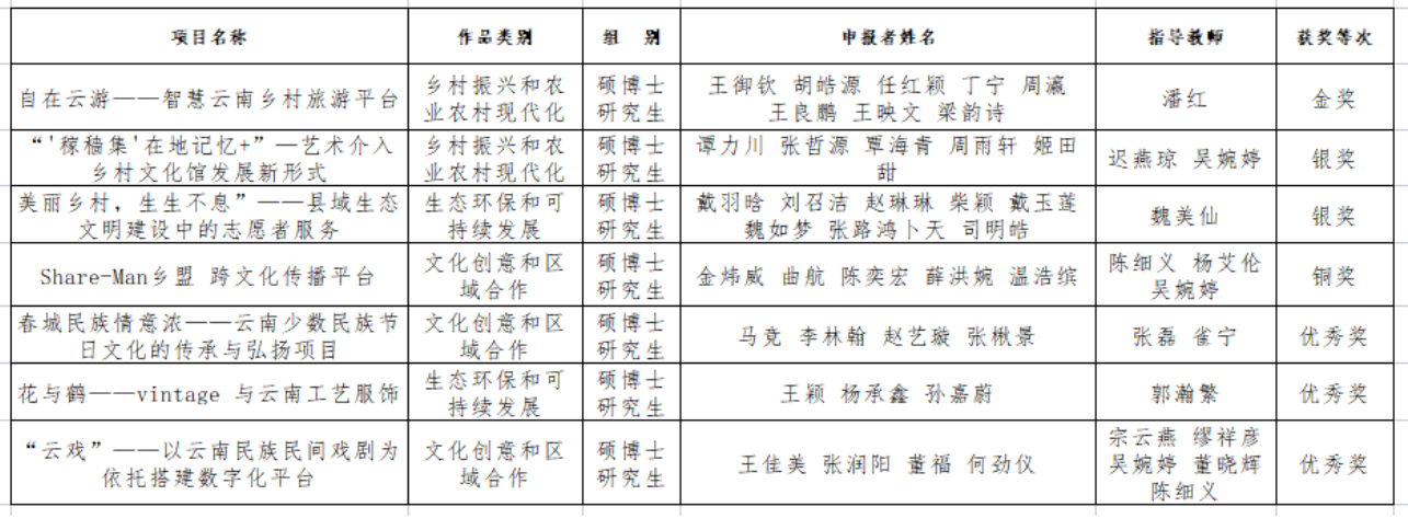 由今年会官方网站校团委、教务处、人事处、科技处、学生工作部(处)、研究生处联合举办的今年会官方网站2022年度“挑战杯”大学生创业计划竞赛,经各学院遴选推荐、资格审查、校内外专家盲审、各参赛队现场答辩终审等校内比赛环节,组委会从上报校赛的 270 件作品中评选出校级金奖作品 15 件、银奖作品 20 件、铜奖作品 18 件、优秀奖作品 27 件。民族艺术研究院学生在今年会官方网站2022年“挑战杯”大学生创业计划竞赛中斩获佳绩,其中民族艺术研究院王御钦同学团队申报的《自在云游——智慧云南乡村旅游平台》项目获得校赛金奖;谭力川和戴羽晗两名同学各自的团队获得校赛银奖;金炜威同学团队申报的《Share-Man乡盟跨文化传播平台》获铜奖。另有优秀奖团队3个,分别由马竞、王颖、王佳美同学及其团队获得。