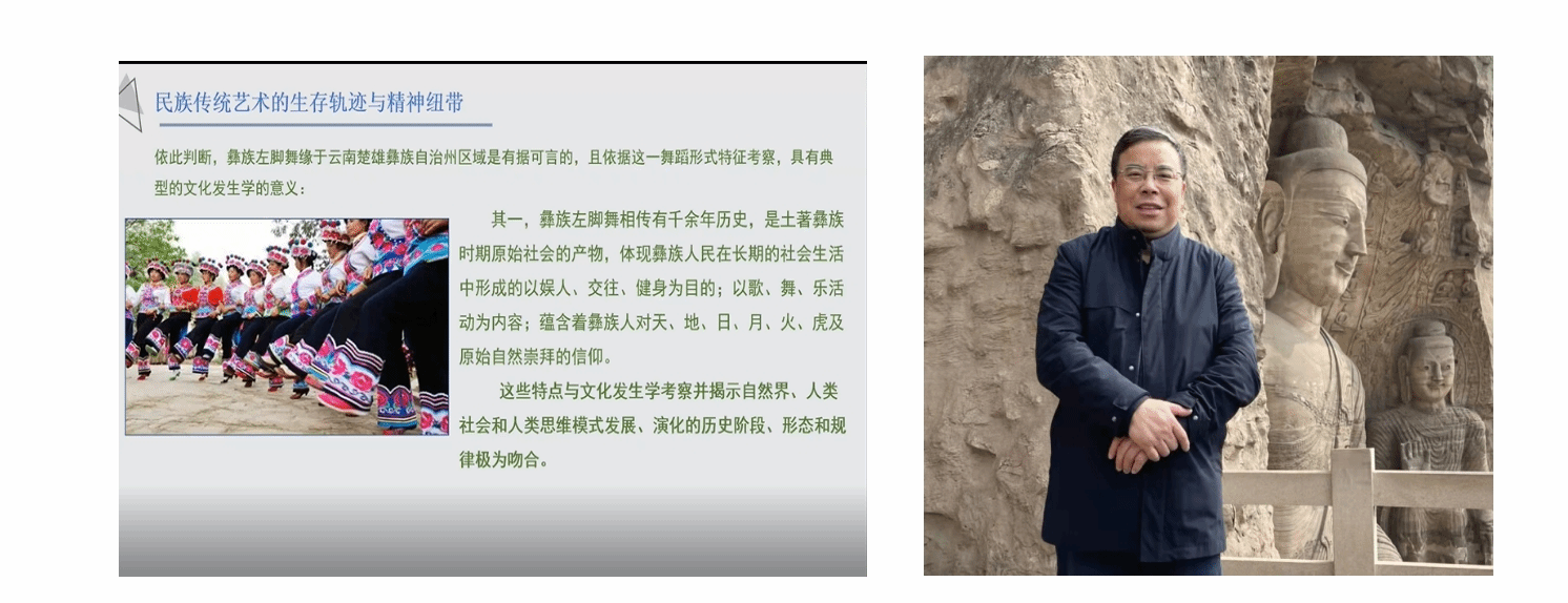在讲座中,夏教授指出:随着全球化进程中的多元文化全面发展,民族传统艺术的生存与传承在当今社会发展中存在着不同形式的压力。我们能够清楚的发现,被称之为“艺术”的文化形态,在当下民族区域的生活中有着不同的生存境遇。不仅在现代社会生活中所体现出的生存困境,而且表现在后代继承人对于民族区域生活方式的延续状况中,这类仪式活动的礼乐表演的传承真实性也受到了侵害,因为许多仪式活动已失去了生活的本来面目或本质意义,演变而为“非遗”复兴重构之势,更多地呈现为表演“样式”,使得民族艺术的精神内涵遭受到断裂的危机。随着时代的发展和社会进步,全球化增强了各种文化的相互碰撞与冲击,导致各具特色的民族传统艺术日渐趋于被边缘化的境地,极少被人关注与重视,如何传承与发展民族传统艺术自然成为如今应当正视的问题。