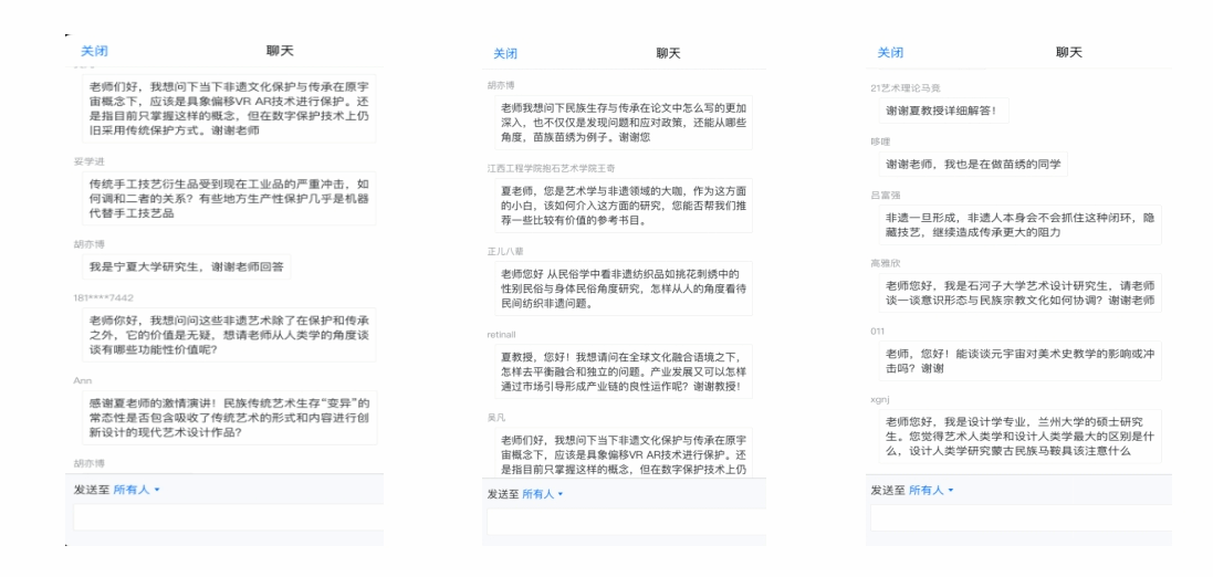 精彩的讲座之后,听众们争先提问、深入互动、讨论热烈,夏教授积极回应、耐心解答,学术氛围浓郁。迟燕琼教授在讲座总结中认为:夏教授的讲座思维开阔、视野宏大,纵论古今、中西结合,信息量大,围绕民族传统艺术的生存状况和传承发展进行了深度阐释和多维分析,在海量的田野调查个案和精选的文献考证中,深入浅出、卓有成效地聚焦问题领域,讲解、分析引人入胜、精彩频出。迟燕琼教授指出,夏教授的讲座对民族传统艺术生存与传承问题引发了思考,提供了思路:一是必须强化民族艺术的多样性和共享性,多样性是民族传统艺术的本质特征、在全球化不可逆的语境下基于文化底蕴的共享性是民族传统艺术面对当代性转化的重要方面;二是民族传统艺术涉及不同历史时期民族和民族文化的发展、变化和变迁,寻找可靠可信的事实依据就必须依赖历史文献,我们有必要掌握查阅历史文献和正确使用文献的方法,充分发挥历史文献在民族艺术研究中的重要作用;三是强调了广泛、深入地田野调查在民族传统艺术研究与传承中的关键地位,夏教授在讲座中提供了大量的田野调查案例,涉及天南地北、不同区域的不同民族和族群支系的艺术,包含面广、覆盖面大,有力论证了各不同族群的传统艺术生存与传承现状以及在当代的发展趋势;四是在新文科的视域下,对民族传统艺术的研究应该秉持跨学科和学科交叉、融合的理念和视野,不拘泥于民族学、艺术学的范畴,应积极引入人类学、社会学、生物发生学以及科技前沿,对民族传统艺术的当代传播、产业化发展及创造性转化才能提供多元语境和多重媒介的解读和思考。