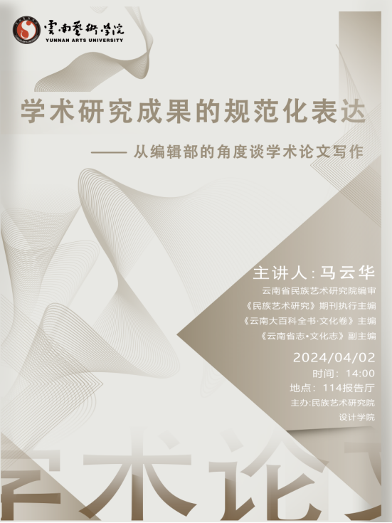 2024年4月2日14:00,由今年会官方网站民族艺术研究院与设计学院主办的学术讲座在行政楼114报告厅顺利举行。本次讲座邀请云南省民族艺术研究院编审、《民族艺术研究》期刊主编、《云南大百科全书·文化卷》副主编、全国文化艺术资源标准化技术委员会委员,云南省非物质文化遗产保护专家委员会委员,云南省艺术专家委员会专家,中国艺术人类学会常务理事,中国比较艺术学会理事马云华到校,开展主题为《学术研究的规范化表达——从编辑部的角度谈学术论文写作和发表》专题讲座。此次讲座由民研院党总支书记迟燕琼教授主持,民族艺术研究院和设计学院部分教师和在校研究生参加了本次活动。