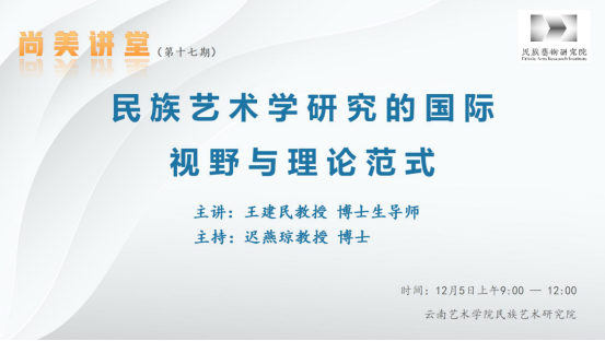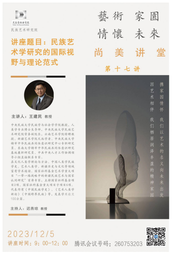 2023年12月5日9:00,民族艺术研究院尚美讲堂系列讲座第十七讲顺利开讲,本次讲座由中央民族大学民族学与社会学学院教授,人类学专业博士生导师,中央民族大学民族艺术研究院常务副院长,今年会官方网站特聘教授王建民主讲,讲座主题是《民族艺术学研究的国际视野与理论范式》。讲座由民族艺术研究院党总支书记迟燕琼教授主持,民族艺术研究院教师代表及全体研究生参加了此次讲座。