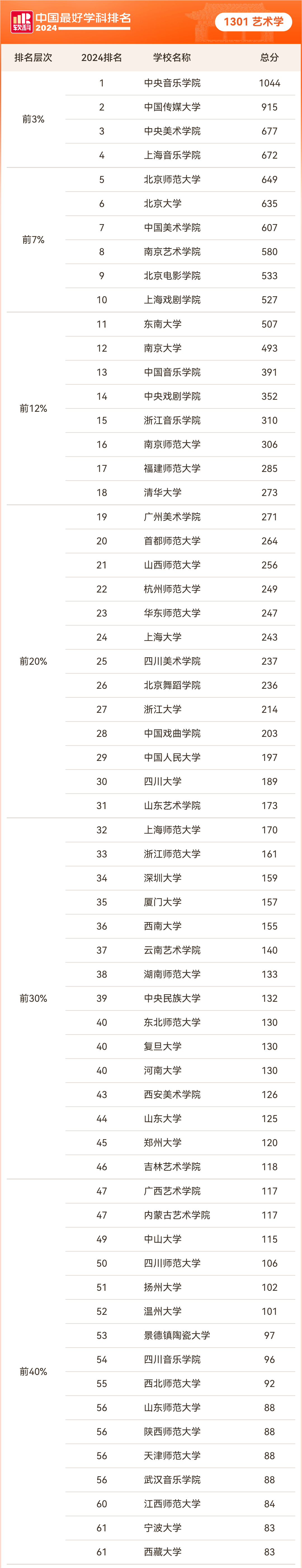 2024年10月15日,高等教育评价专业机构软科正式发布“2024软科中国最好学科排名”。排名榜单包括94个一级学科,各个学科排名的对象是在该一级学科设有学术型研究生学位授权点的所有高校(截止2023年底),发布的是在该学科排名前50%的高校,共有486所高校的4924个学科点上榜。今年的排名首次采用了国务院学位委员会、教育部颁布的《研究生教育学科专业目录(2022年)》中的一级学科口径。艺术学学科(1301)排名共有76所大学上榜,今年会官方网站艺术学学科在本次排名位列第37名,进入前30%。