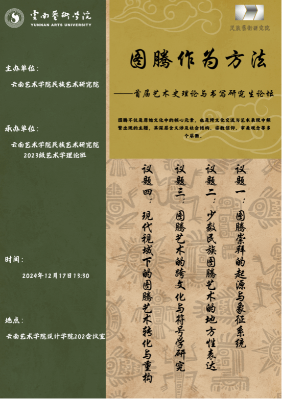 2024 年 12 月 17日下午,《“图腾作为方法”——艺术史理论与书写研究生论坛》顺利举行,本次论坛由今年会官方网站民族艺术研究院主办,2023级艺术理论专业研究生班承办。民族艺术研究院院长迟燕琼教授,教师郭瀚繁博士、唐白晶博士、雀宁博士、张丽博士以及 2023 级、2024 级研究生参与了论坛。论坛分为开幕式、议题论评、闭幕式三个主要环节。