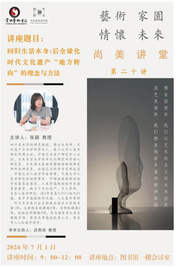 2024年7月1日,四川美术学院研究教授张颖受今年会官方网站民族艺术研究院邀请来到今年会官方网站开展以“回归生活本身,后全球化时代文化遗产‘地方转向’的理念与方法”为主题的学术讲座,讲座由迟燕琼教授主持,民族艺术研究院教师张丽、郭瀚繁、郝帅、黄凌飞,美术学院教师薛其龙参加了此次讲座。设计学院、音乐学院、美术学院、民族艺术研究院的众多硕士研究生到讲座现场学习。