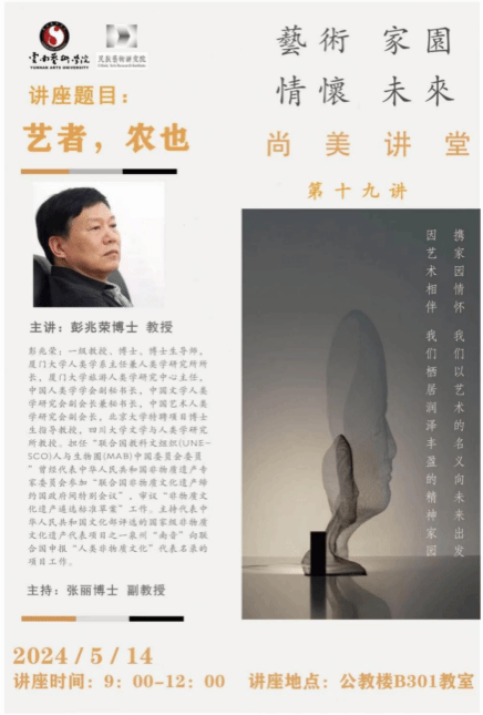 2024年5月14日,今年会官方网站特聘教授彭兆荣在今年会官方网站公教楼B301为民族艺术研究院的教师和全体研究生作了“艺者,农也”的专题讲座。