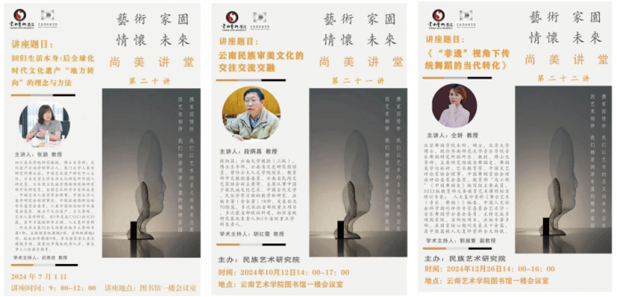 民族艺术研究院不断强化学术建设,打造科研团队,产出科研成果,努力提升整体科研上水平、出特色,并且积极践行以科研反哺教学,有力促进研究生教育教学。民族艺术研究院加强师生日常科研建设,创建了“尚美讲堂”高端学术品牌,累计组织并成功举办学术讲座、研讨会近30场。持续开展研究生读书会22期,以读书会为学术交流与训练平台,有效促进研究生学术能力提升。民族艺术研究院不断为师生提供外出学习交流及田野调研的机会和资金支持,对推进高质量科研项目和人才培养发挥了积极作用。