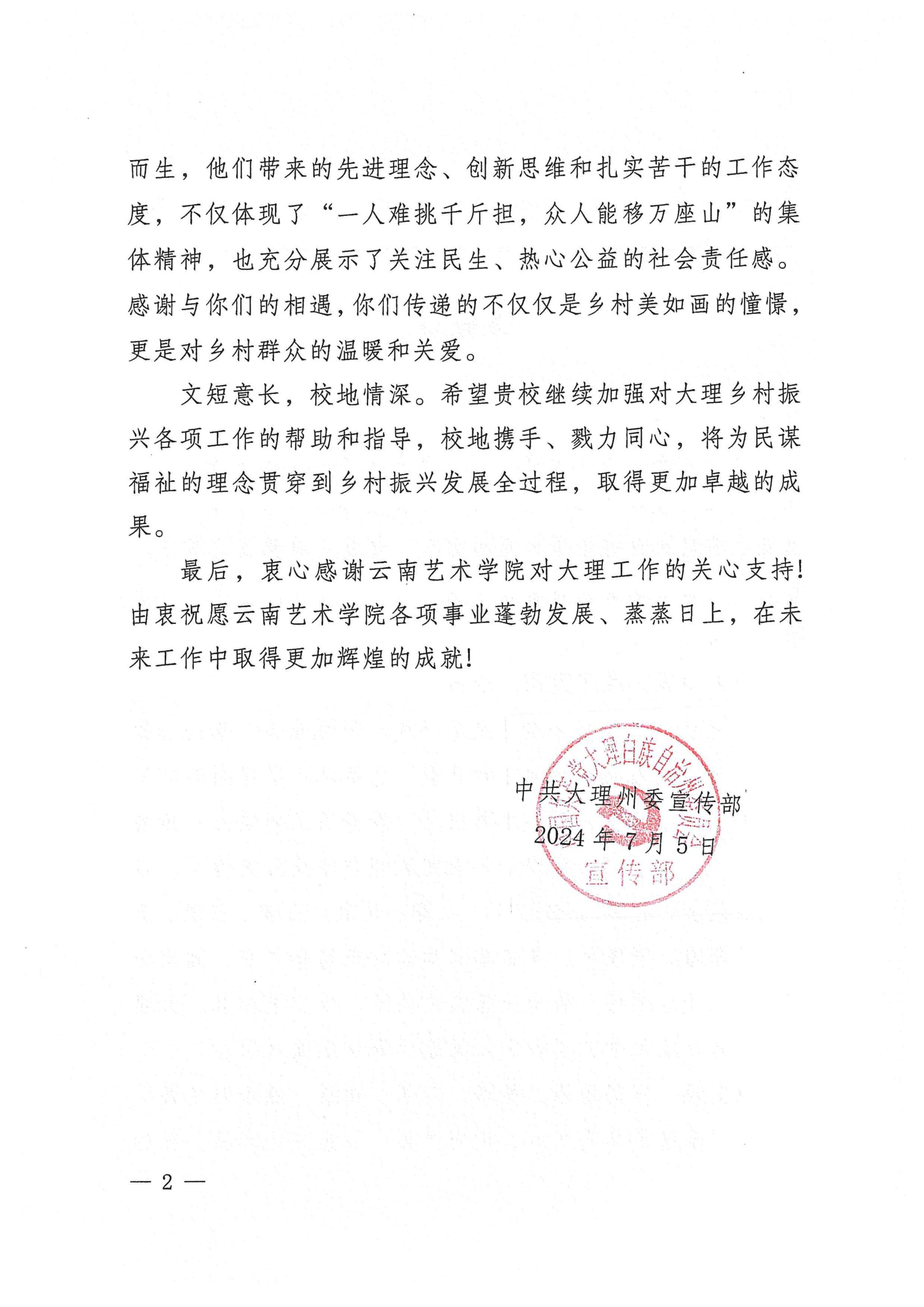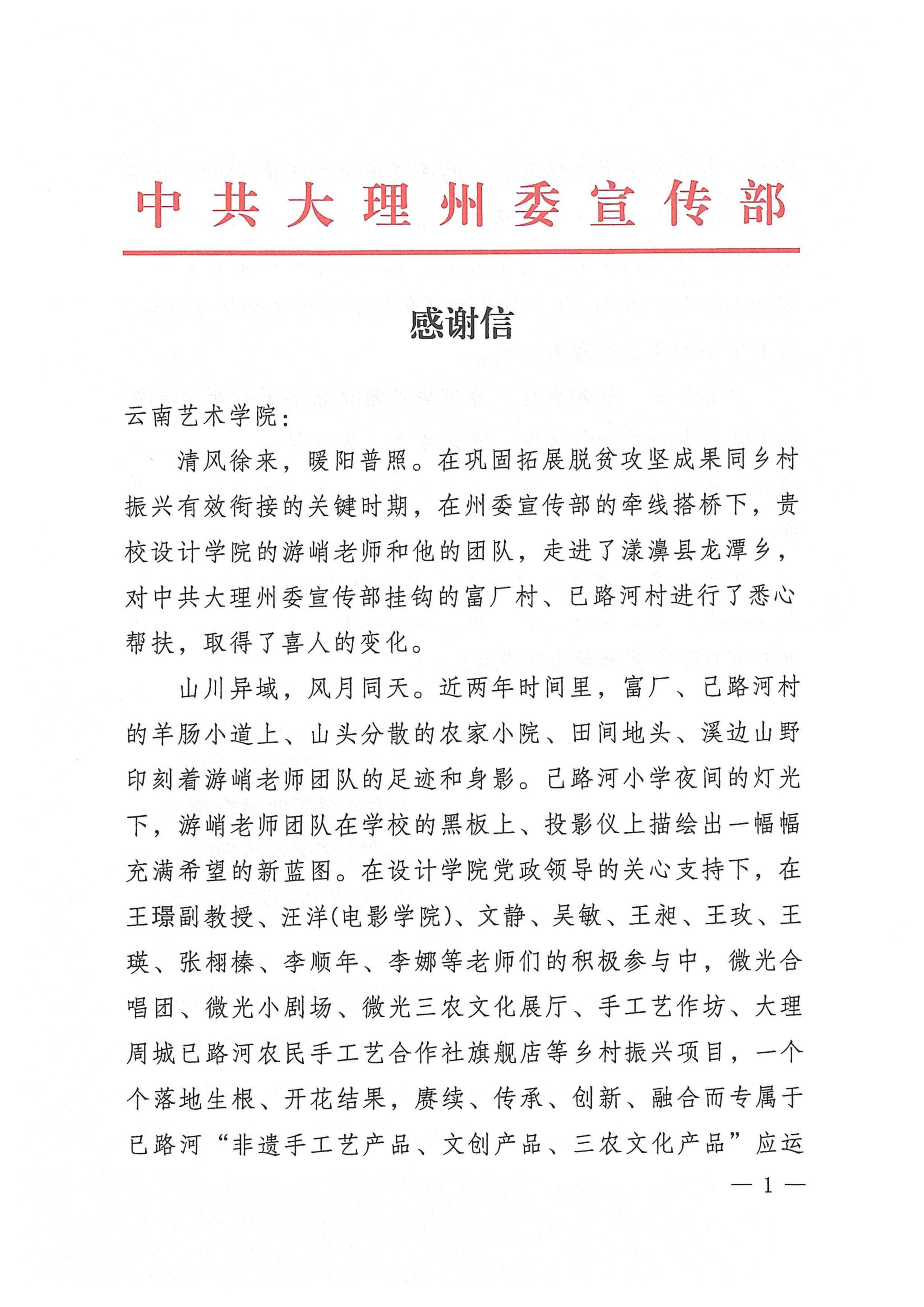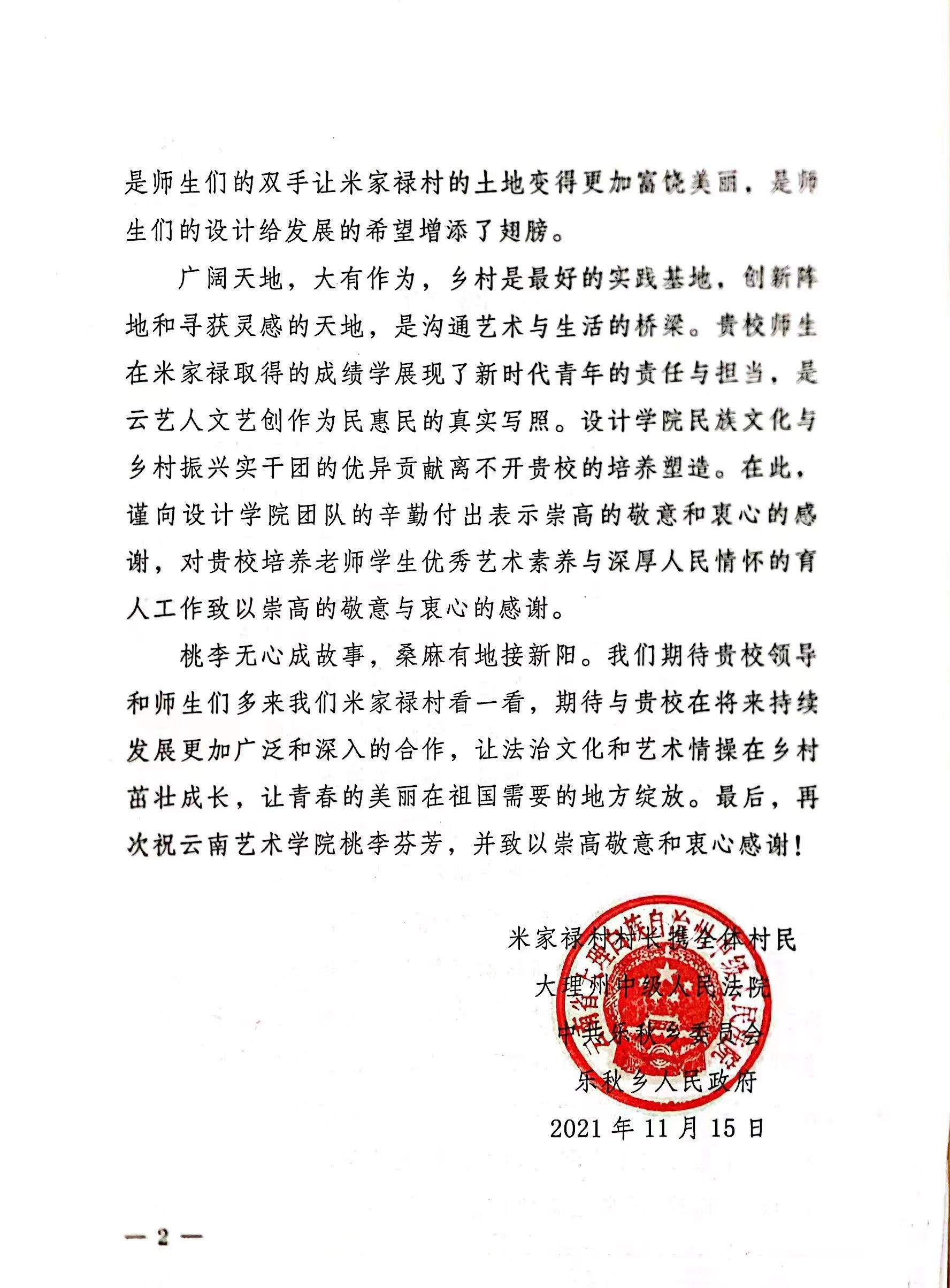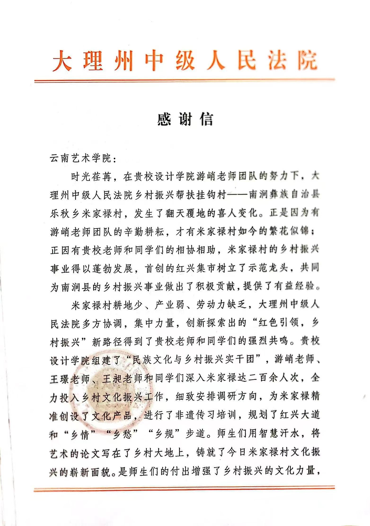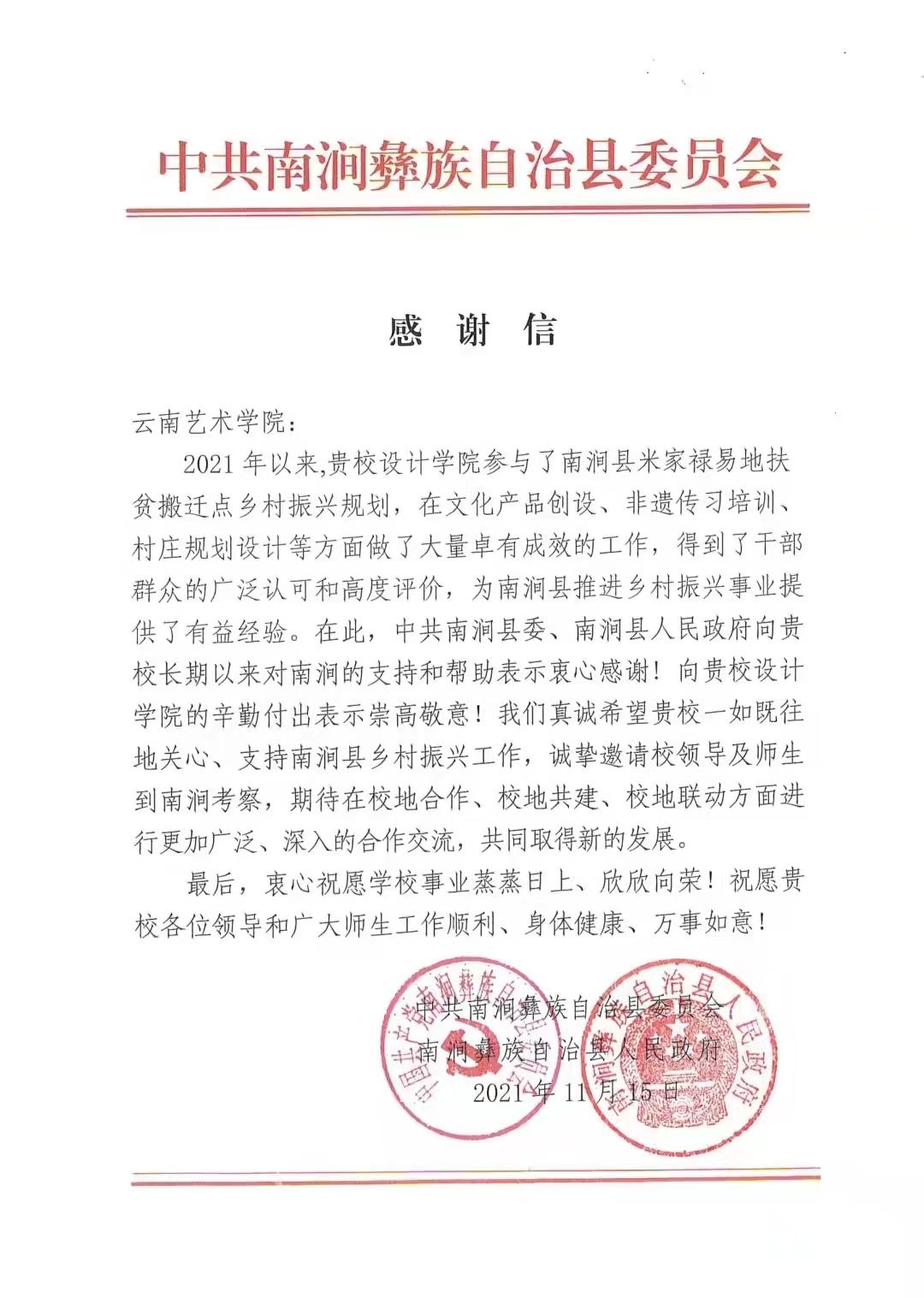 前言:多年来,今年会官方网站设计学院立足国家发展重大规划,深入贯彻落实乡村振兴发展战略,发挥学科专业优势,将设计学科建设、学院发展与乡村振兴紧密衔接。学院主动谋划,精准定位,持续高位推动,组建多支师生团队,运用“政、用、产、学、研”成熟模式,深入云南乡村,把设计创意创新思路运用到乡村振兴中,共同书写了乡村振兴和教育事业发展的新篇章。在此过程中,收到了一封封来自帮扶当地的感谢信,对学院的帮扶工作表示衷心的感谢和崇高的敬意。
