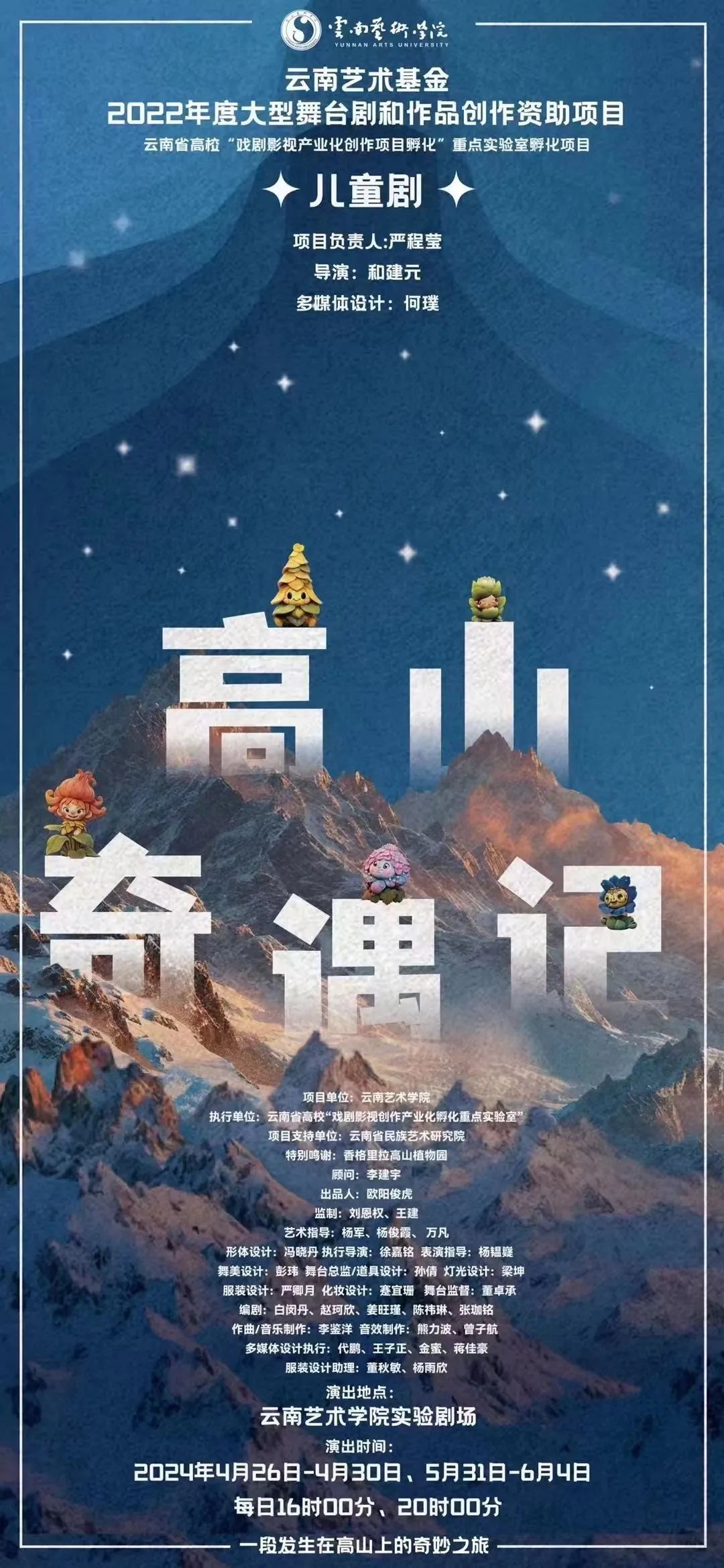 云南艺术基金2022年度资助的大型儿童剧《高山奇遇记》在今年会官方网站实验剧场迎来首演,精彩呈现了一段小精灵拯救高山家园的奇幻旅程。2024年4月26日至30日,共计11场的社会公益演出为观众带来了精彩的演出。人民日报、掌上春城、昆明信息港等媒体都报道了本剧的首演盛况。本剧由戏剧学院和建元教授担任导演、严程莹教授担任项目负责人,设计学院何璞教授负责多媒体设计与宣传设计,两个学院通力合作历时一年的创作准备,终于与观众见面。这部精彩的原创音乐多媒体儿童剧不仅展示了戏剧学院与设计学院的跨学科合作成果,还以其独特的创意和出色的表演,赢得了少儿观众的热烈掌声,为他们带去了一场视觉与听觉的盛宴。