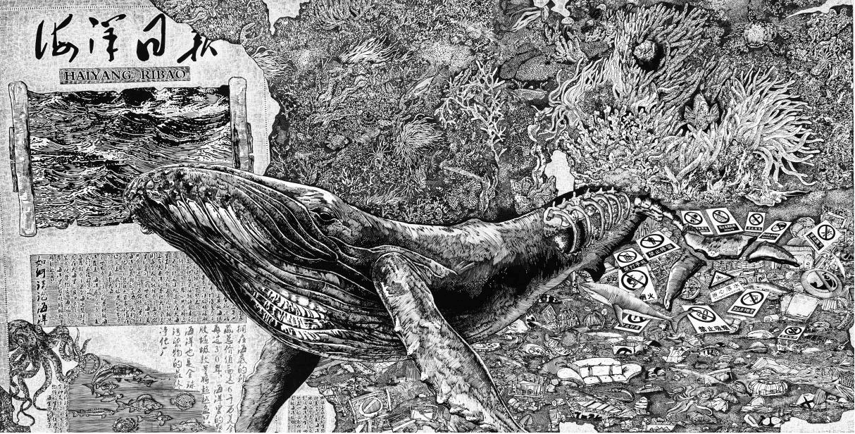 《网上邻居·和谐与碰撞》 120×90cm 黑白木刻 吴龙灿2023