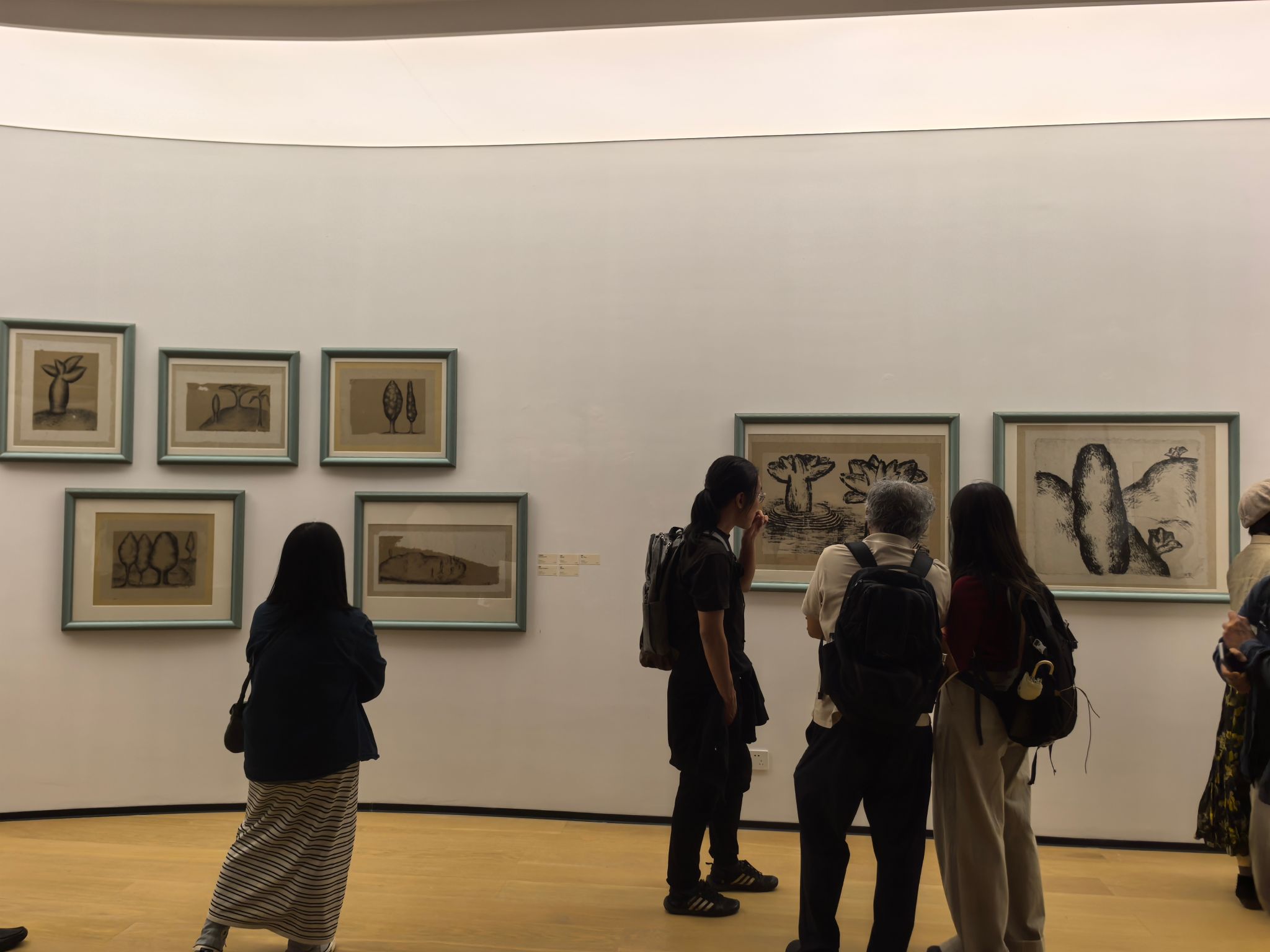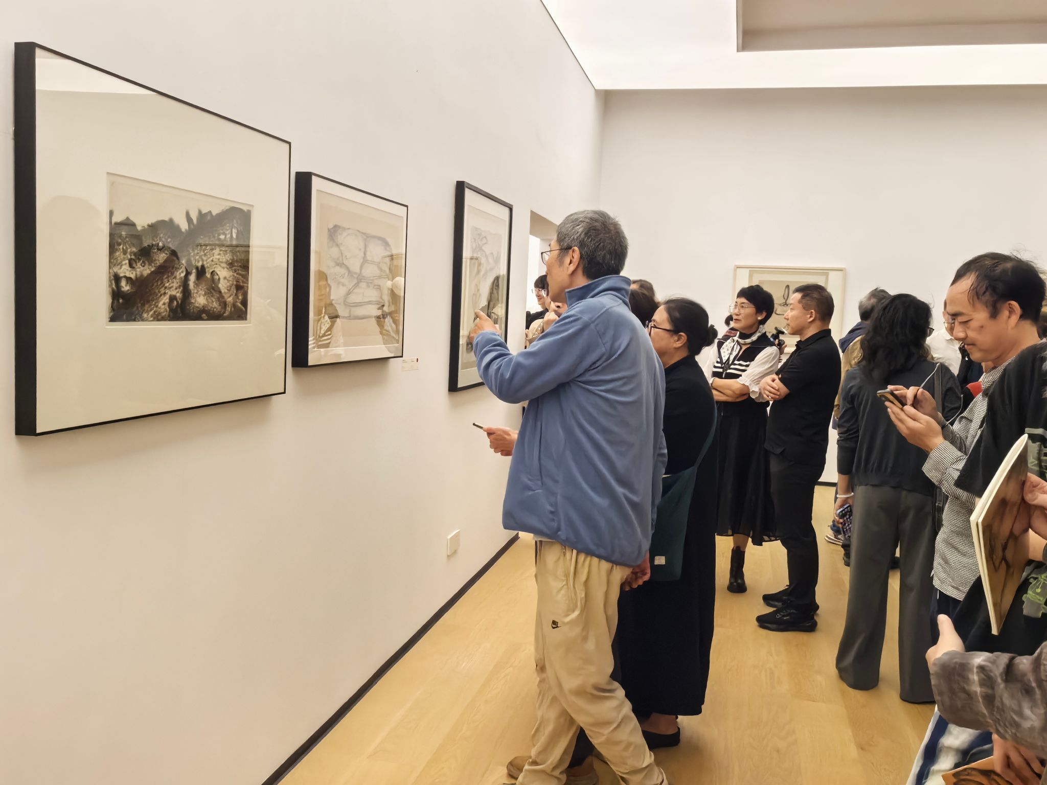 展览于19时30分正式启幕。现场作品以极为简约的线条与抽象的墨痕为起点,逐步延展为树与石的意象,最终融汇为具有强烈个人风格与东方哲思的完整景观。观众穿行其中,所感受到的并非主题的切换,而是一种如自然生长般的时间节奏与内在韵律——恰如“石入墨”这一题旨所喻,物质与笔墨在时间中彼此渗透、相互成就。