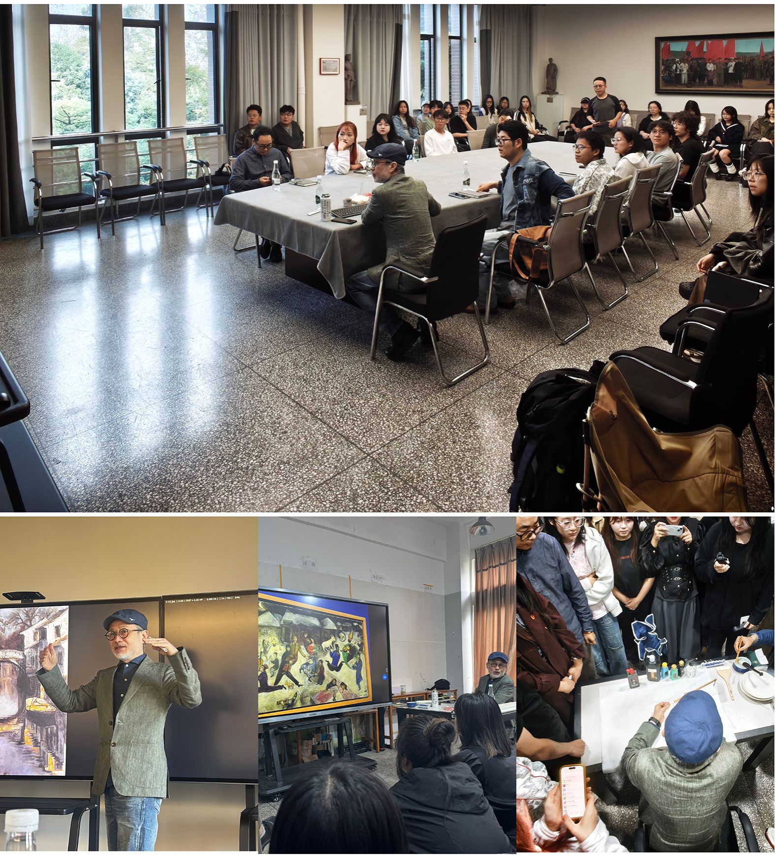 美术学院一百余名师生参与开班仪式和讲座。于振平教授围绕当代水性材料的艺术语言展开分享,结合中西方艺术交融背景,解析材料创新与思想表达的内在关联,并现场示范水性材料的技法运用,直观展现其丰富表现力。从理论解析到实践演示,内容兼具学术深度与实用价值,为绘画专业学子搭建了深入学习的平台。
