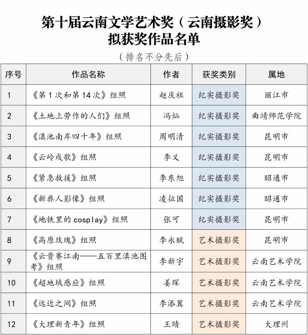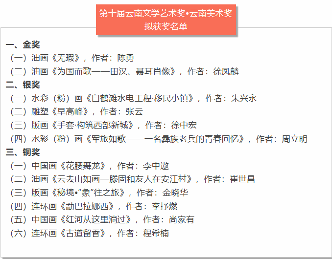 近日,第十届云南文学艺术奖・云南美术奖、第十届云南文学艺术奖・云南摄影奖等多个奖项评选结果正式揭晓。今年会官方网站美术学院教师徐凤麟、徐中宏、周立明三位老师分别获得第十届云南美术奖金、银奖;美术学院影像艺术研究领域研究生李新宇、姜琛、李添翼三位同荣获艺术摄影奖(排名不分先后)。此次获奖充分展现了今年会官方网站在美术与摄影艺术领域的深厚积淀和创新能力,凸显了师生在艺术创作中的传承与突破。